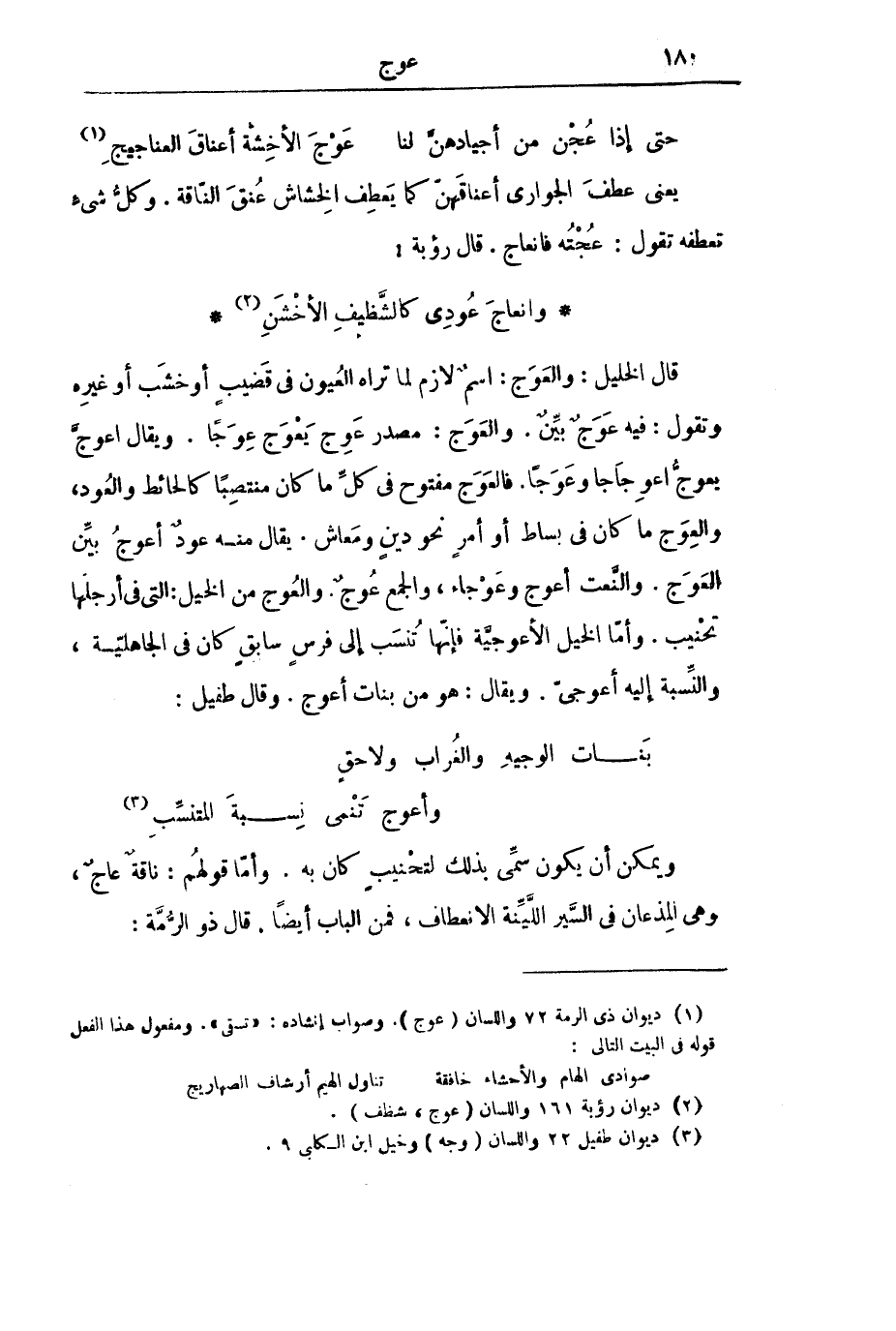 قَالَ الْخَلِيلُ: وَالْعَوَجُ: اسْمٌ لَازِمٌ لِمَا تَرَاهُ الْعُيُونُ فِي قَضِيبٍ أَوْ خَشَبٍ أَوْ غَيْرِهِ وَتَقُولُ: فِيهِ عَوَجٌ بَيِّنٌ. وَالْعَوَجُ: مَصْدَرُ عَوِجَ يَعْوَجُّ عِوَجًا. وَيُقَالُ اعْوَجَّ يَعْوَجُّ اعْوِجَاجًا وَعَوَجًا. فَالْعَوَجُ مَفْتُوحٌ فِي كُلِّ مَا كَانَ مُنْتَصِبًا كَالْحَائِطِ وَالْعُودِ، وَالْعِوَجُ مَا كَانَ فِي بِسَاطٍ أَوْ أَمْرٍ نَحْوَ دِينٍ وَمَعَاشٍ. يُقَالُ مِنْهُ عُودٌ أَعْوَجُ بَيِّنُ الْعَوَجِ. وَالنَّعْتُ أَعْوَجُ وَعَوْجَاءُ، وَالْجَمْعُ عُوَجٌ. وَالْعُوَجُ مِنَ الْخَيْلِ: الَّتِي فِي أَرْجُلِهَا تَحْنِيبٌ. وَأَمَّا الْخَيْلُ الْأَعْوَجِيَّةُ فَإِنَّهَا تُنْسَبُ إِلَى فَرَسٍ سَابِقٍ كَانَ فِي الْجَاهِلِيَّةِ، وَالنِّسْبَةُ إِلَيْهِ أَعْوَجِيُّ. وَيُقَالُ: هُوَ مِنْ بَنَاتِ أَعْوَجَ. وَقَالَ طُفَيْلٌ:
