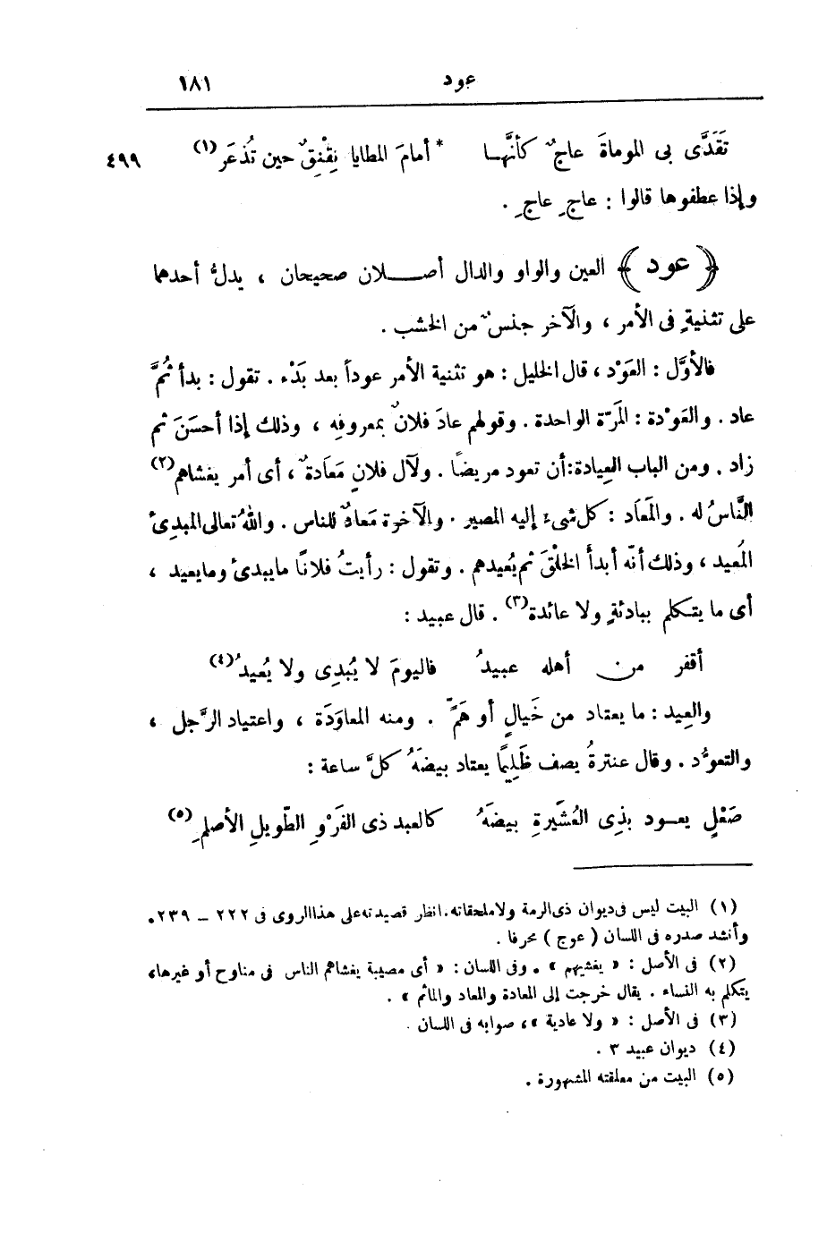 فَالْأَوَّلُ: الْعَوْدُ، قَالَ الْخَلِيلُ: هُوَ تَثْنِيَةُ الْأَمْرِ عَوْدًا بَعْدَ بَدْءٍ. تَقُولُ: بَدَأَ ثُمَّ عَادَ. وَالْعَوْدَةُ: الْمَرَّةُ الْوَاحِدَةُ. وَقَوْلُهُمْ عَادَ فُلَانٌ بِمَعْرُوفِهِ، وَذَلِكَ إِذَا أَحْسَنَ ثُمَّ زَادَ. وَمِنَ الْبَابِ الْعِيَادَةُ: أَنْ تَعُودَ مَرِيضًا. وَلِآلِ فُلَانٍ مَعَادَةٌ، أَيْ أَمْرٌ يَغْشَاهُمُ النَّاسُ لَهُ. وَالْمَعَادُ: كُلُّ شَيْءٍ إِلَيْهِ الْمَصِيرُ. وَالْآخِرَةُ مَعَادٌ لِلنَّاسِ. وَاللَّهُ - تَعَالَى - الْمُبْدِئُ الْمُعِيدُ، وَذَلِكَ أَنَّهُ أَبْدَأَ الْخَلْقَ ثُمَّ يُعِيدُهُمْ. وَتَقُولُ: رَأَيْتُ فُلَانًا مَا يُبْدِئُ وَمَا يُعِيدُ، أَيْ مَا يَتَكَلَّمُ بِبَادِئَةٍ وَلَا عَائِدَةٍ. قَالَ عُبَيْدٌ:
