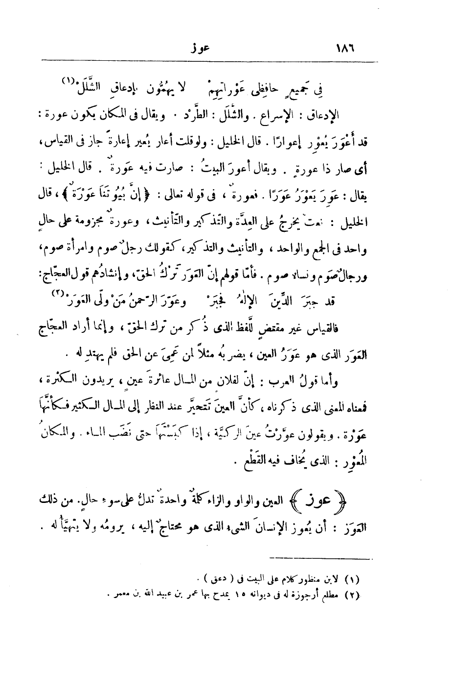 الْإِدْعَاقُ: الْإِسْرَاعُ. وَالشَّلَلُ: الطَّرْدُ. وَيُقَالُ فِي الْمَكَانِ يَكُونُ عَوْرَةً: قَدْ أَعْوَرَ يُعْوِرُ إِعْوَارًا. قَالَ الْخَلِيلُ: وَلَوْ قُلْتُ أَعَارَ يُعِيرُ إِعَارَةً جَازَ فِي الْقِيَاسِ، أَيْ صَارَ ذَا عَوْرَةٍ. وَيُقَالُ أَعْوَرَ الْبَيْتُ: صَارَتْ فِيهِ عَوْرَةٌ. قَالَ الْخَلِيلُ: يُقَالُ: عَوِرَ يَعْوَرُ عَوَرًا. فَعَوْرَةٌ، فِي قَوْلِهِ - تَعَالَى: {إِنَّ بُيُوتَنَا عَوْرَةٌ} [الأحزاب: 13] ، قَالَ الْخَلِيلُ: نَعْتٌ يَخْرُجُ عَلَى الْعِدَّةِ وَالتَّذْكِيرِ وَالتَّأْنِيثِ، وَعَوْرَةٌ مَجْزُومَةٌ عَلَى حَالٍ وَاحِدٍ فِي الْجَمْعِ وَالْوَاحِدِ، وَالتَّأْنِيثِ وَالتَّذْكِيرِ، كَقَوْلِكَ رَجُلٌ صَوْمٌ وَامْرَأَةٌ صَوْمٌ، وَرِجَالٌ صَوْمٌ وَنِسَاءٌ صَوْمٌ. فَأَمَّا قَوْلُهُمْ إِنَّ الْعَوَرَ تَرْكُ الْحَقِّ، وَإِنْشَادُهُمْ قَوْلَ الْعَجَّاجِ: