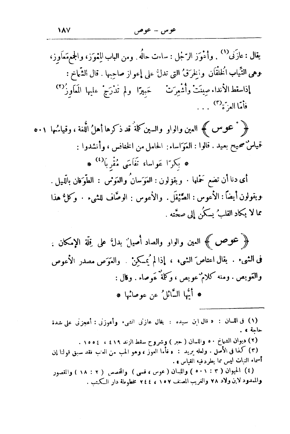 أَيْ دَنَا أَنْ تَضَعَ حَمْلَهَا. وَيَقُولُونَ: الْعَوَسَانُ وَالْعَوْسُ: الطَّوَفَانُ بِاللَّيْلِ. وَيَقُولُونَ أَيْضًا: الْأَعْوَسُ: الصَّيْقَلُ. وَالْأَعْوَسُ: الْوَصَّافُ لِلشَّيْءِ. وَكُلُّ هَذَا مِمَّا لَا يَكَادُ الْقَلْبُ يَسْكُنُ إِلَى صِحَّتِهِ.