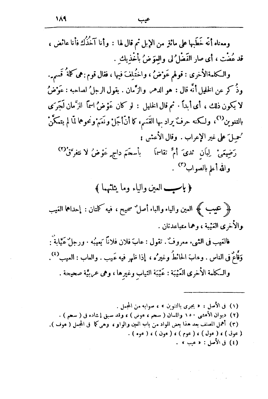 وَالْكَلِمَةُ الْأُخْرَى: قَوْلُهُمْ عَوْضُ، وَاخْتُلِفَ فِيهَا، فَقَالَ قَوْمٌ هِيَ كَلِمَةُ قَسَمٍ. وَذُكِرَ عَنِ الْخَلِيلِ أَنَّهُ قَالَ: هُوَ الدَّهْرُ وَالزَّمَانُ. يَقُولُ الرَّجُلُ لِصَاحِبِهِ: عَوْضُ لَا يَكُونُ ذَلِكَ، أَيْ أَبَدًا. ثُمَّ قَالَ الْخَلِيلُ: لَوْ كَانَ عَوْضُ اسْمًا لِلزَّمَانِ لَجَرَى بِالتَّنْوِينِ، وَلَكِنَّهُ حَرْفٌ يُرَادُ بِهَا الْقَسَمُ، كَمَا أَنَّ أَجَلْ وَنَعَمْ وَنَحْوَهُمَا لَمَّا لَمْ يَتَمَكَّنْ حُمِلَ عَلَى غَيْرِ الْإِعْرَابِ. وَقَالَ الْأَعْشَى: