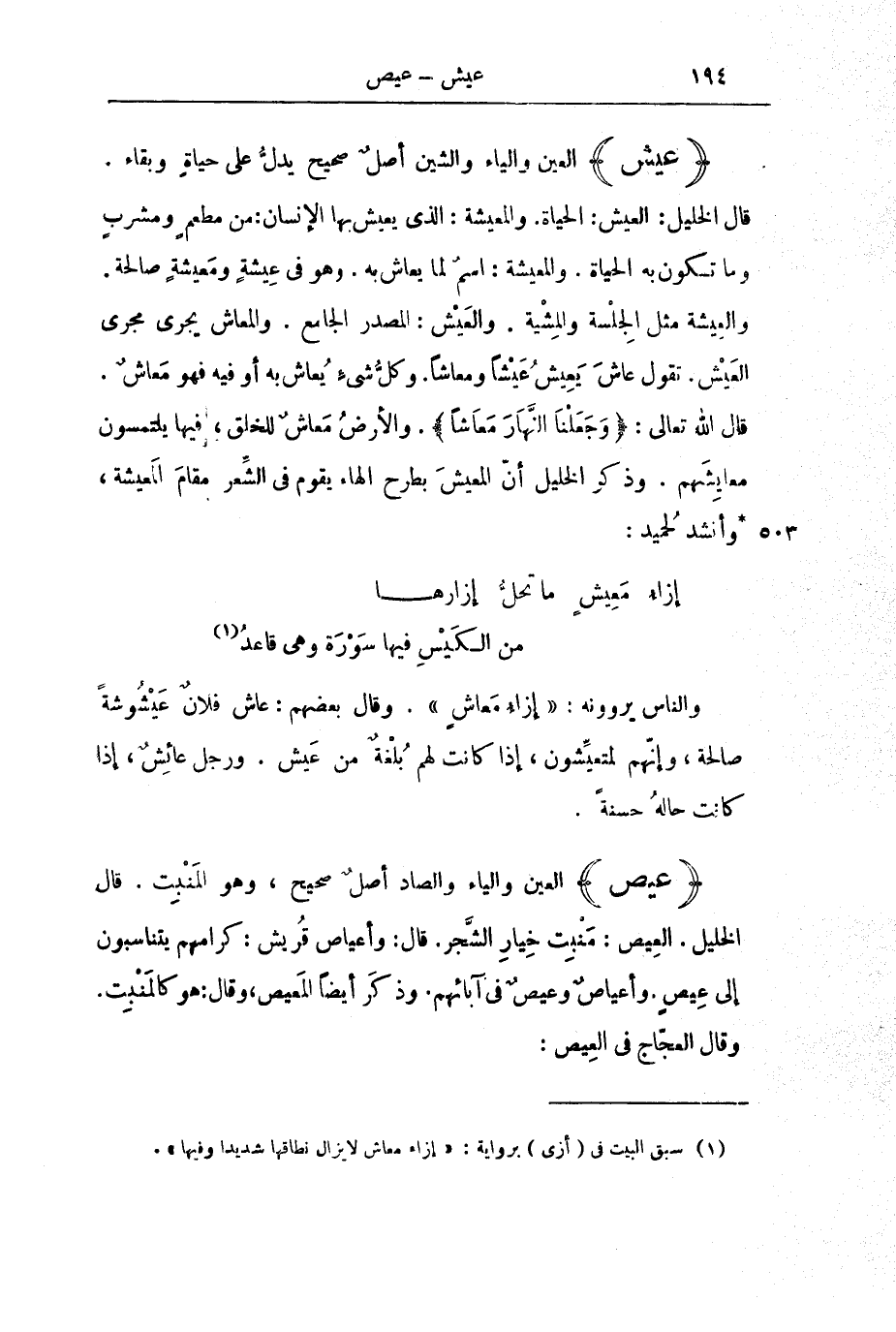 وَالنَّاسُ يَرْوُونَهُ: " إِزَاءُ مَعَاشٍ ". وَقَالَ بَعْضُهُمْ: عَاشَ فُلَانٌ عَيْشُوشَةً صَالِحَةً، وَإِنَّهُمْ لَمُتَعَيِّشُونَ، إِذَا كَانَتْ لَهُمْ بُلْغَةٌ مِنْ عَيْشٍ. وَرَجُلٌ عَائِشٌ، إِذَا كَانَتْ حَالُهُ حَسَنَةً.