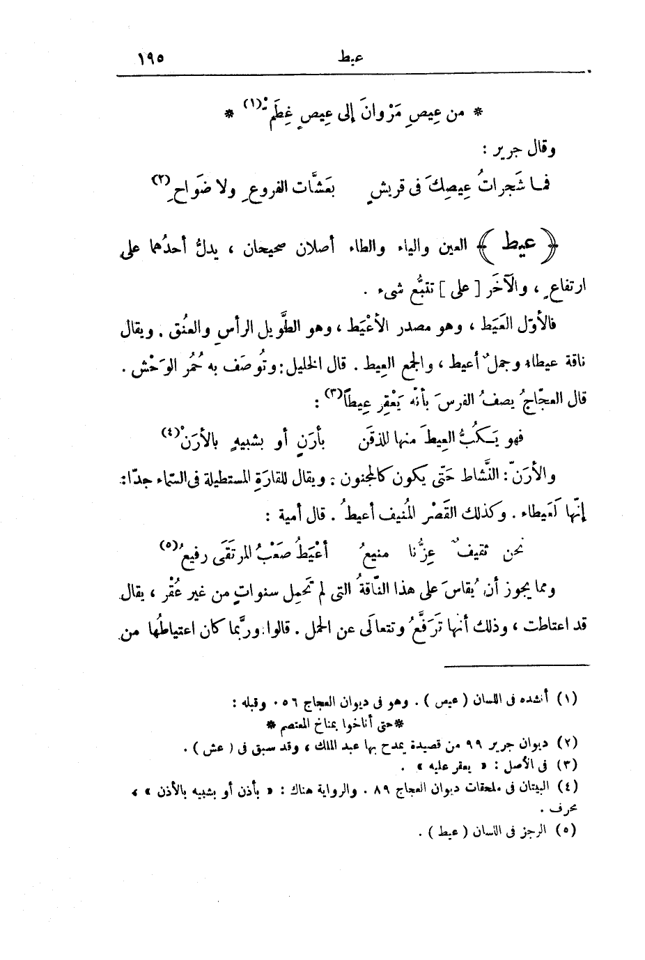 فَهُوَ يَكُبُّ الْعِيَطَ مِنْهَا لِلذَّقَنِ ... بِأَرَنٍ أَوْ بِشَبِيهٍ بِالْأَرَنِ