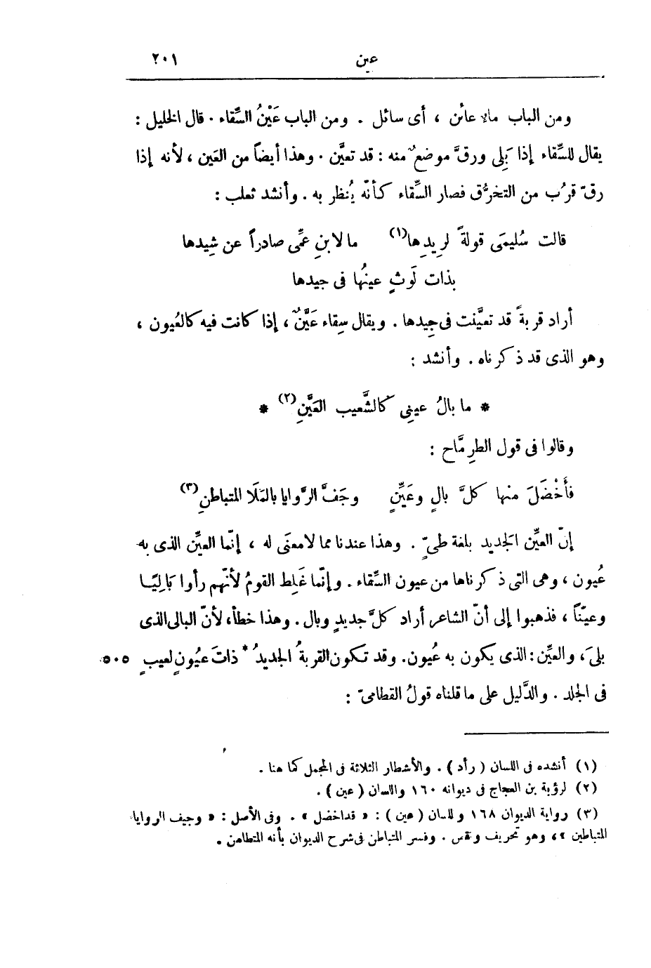 إِنَّ الْعَيِّنَ الْجَدِيدَ بِلُغَةِ طَيٍّ. وَهَذَا عِنْدَنَا مِمَّا لَا مَعْنَى لَهُ، إِنَّمَا الْعَيِّنُ الَّذِي بِهِ عُيُونٌ، وَهِيَ الَّتِي ذَكَرْنَاهَا مِنْ عُيُونِ السِّقَاءِ. وَإِنَّمَا غَلِطَ الْقَوْمُ لِأَنَّهُمْ رَأَوْا بَالِيًا وَعَيِّنًا، فَذَهَبُوا إِلَى أَنَّ الشَّاعِرَ أَرَادَ كُلَّ جَدِيدٍ وَبَالٍ. وَهَذَا خَطَأٌ، لِأَنَّ الْبَالِيَ الَّذِي بَلِيَ، وَالْعَيِّنَ: الَّذِي يَكُونُ بِهِ عُيُونٌ. وَقَدْ تَكُونُ الْقِرْبَةُ الْجَدِيدُ ذَاتَ عُيُونٍ لِعَيْبٍ فِي الْجِلْدِ. وَالدَّلِيلُ عَلَى مَا قُلْنَاهُ قَوْلُ الْقَطَامِيِّ: