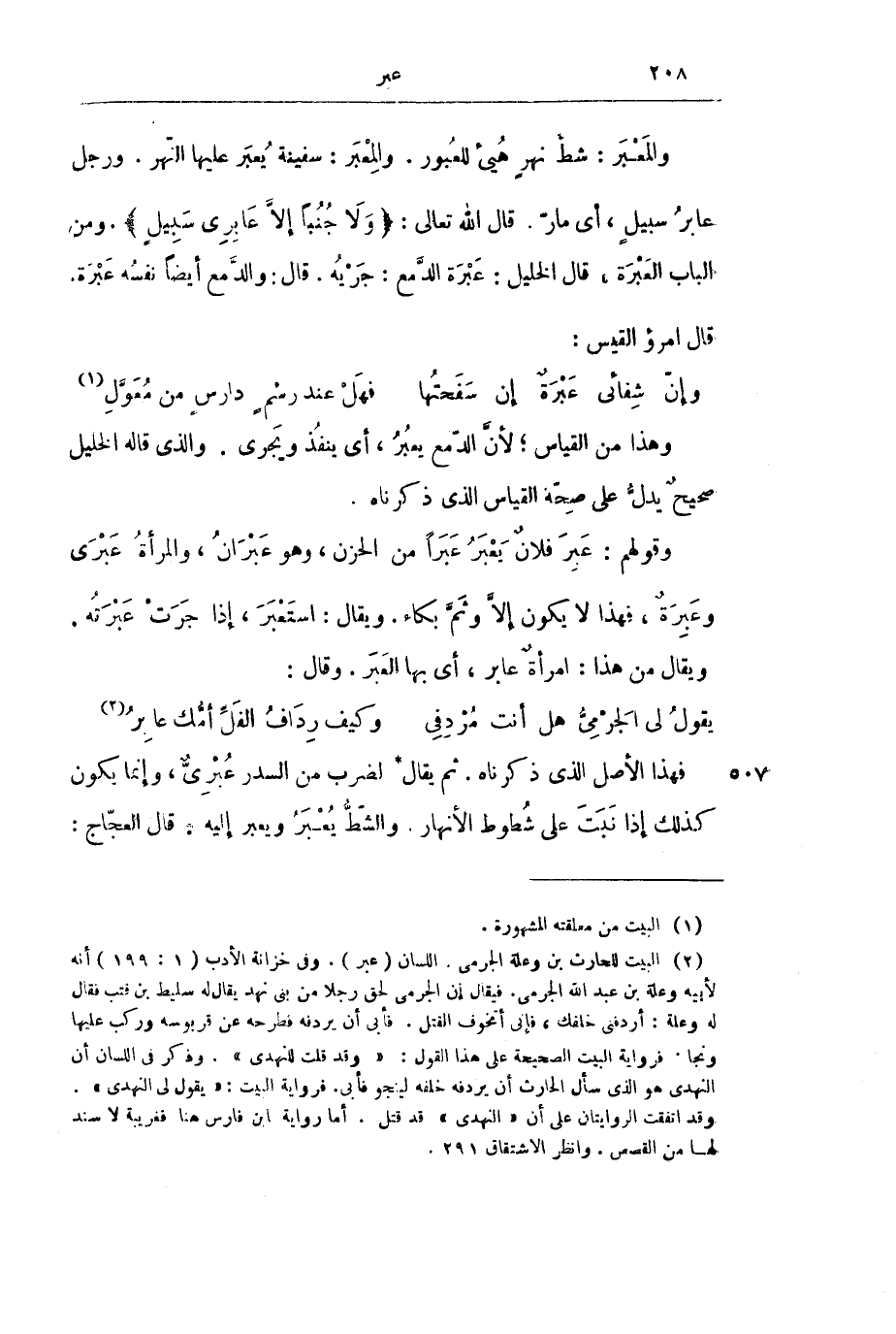 وَالْمَعْبَرُ: شَطُّ نَهْرٍ هُيِّئَ لِلْعُبُورِ. وَالْمِعْبَرُ: سَفِينَةٌ يُعْبَرُ عَلَيْهَا النَّهْرُ. وَرَجُلٌ عَابِرُ سَبِيلٍ، أَيْ مَارٌّ. قَالَ اللَّهُ - تَعَالَى -: {وَلَا جُنُبًا إِلَّا عَابِرِي سَبِيلٍ} [النساء: 43] ، وَمِنَ الْبَابِ الْعَبْرَةُ، قَالَ الْخَلِيلُ: عَبْرَةُ الدَّمْعِ: جَرْيُهُ. قَالَ: وَالدَّمْعُ أَيْضًا نَفْسُهُ عَبْرَةٌ. قَالَ امْرُؤُ الْقَيْسِ: