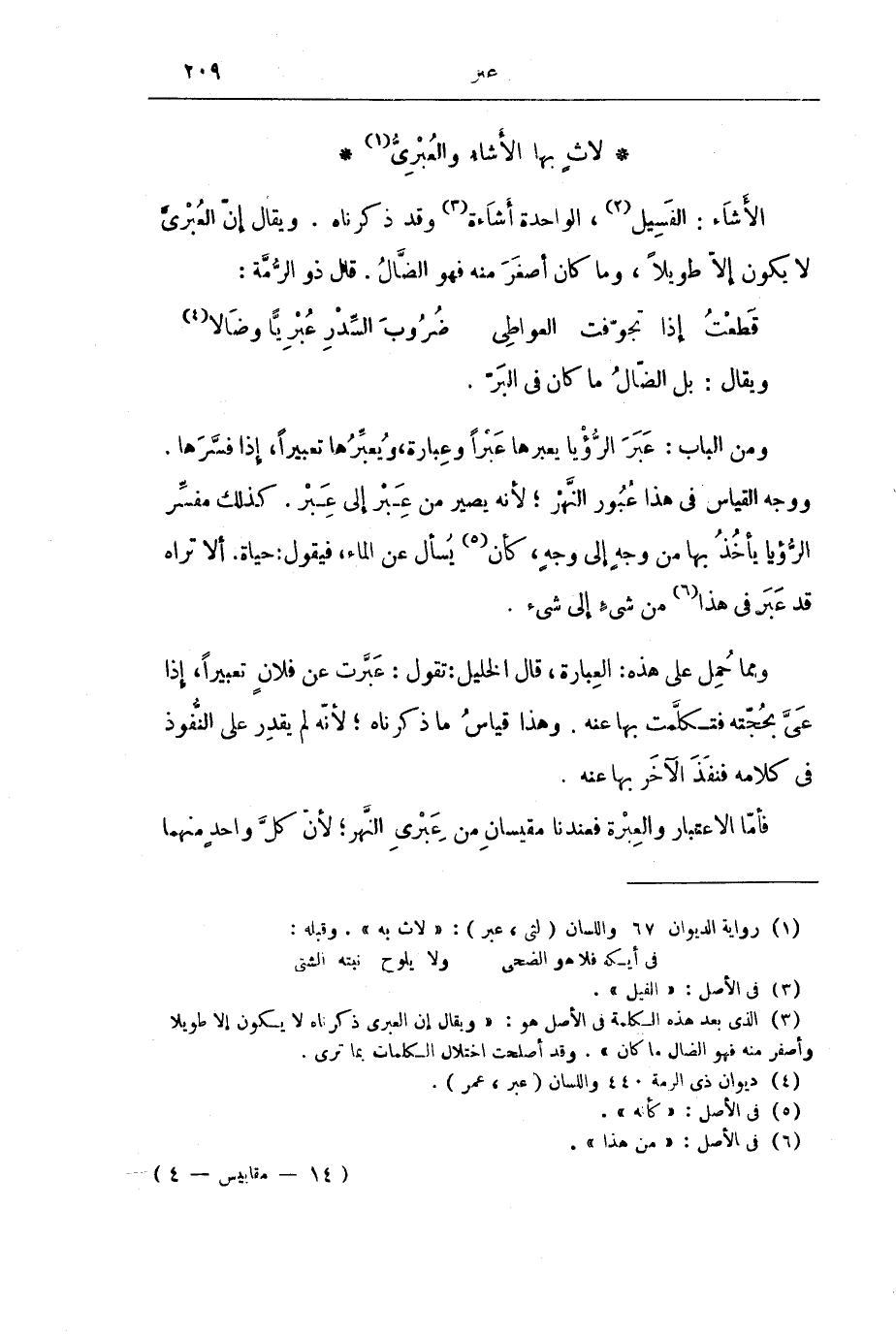 وَمِمَّا حُمِلَ عَلَى هَذِهِ: الْعِبَارَةُ، قَالَ الْخَلِيلُ: تَقُولُ: عَبَّرْتَ عَنْ فُلَانٍ تَعْبِيرًا، إِذَا عَيَّ بِحُجَّتِهِ فَتَكَلَّمْتَ بِهَا عَنْهُ. وَهَذَا قِيَاسُ مَا ذَكَرْنَاهُ; لِأَنَّهُ لَمْ يَقْدِرْ عَلَى النُّفُوذِ فِي كَلَامِهِ فَنَفَذَ الْآخَرُ بِهَا عَنْهُ.