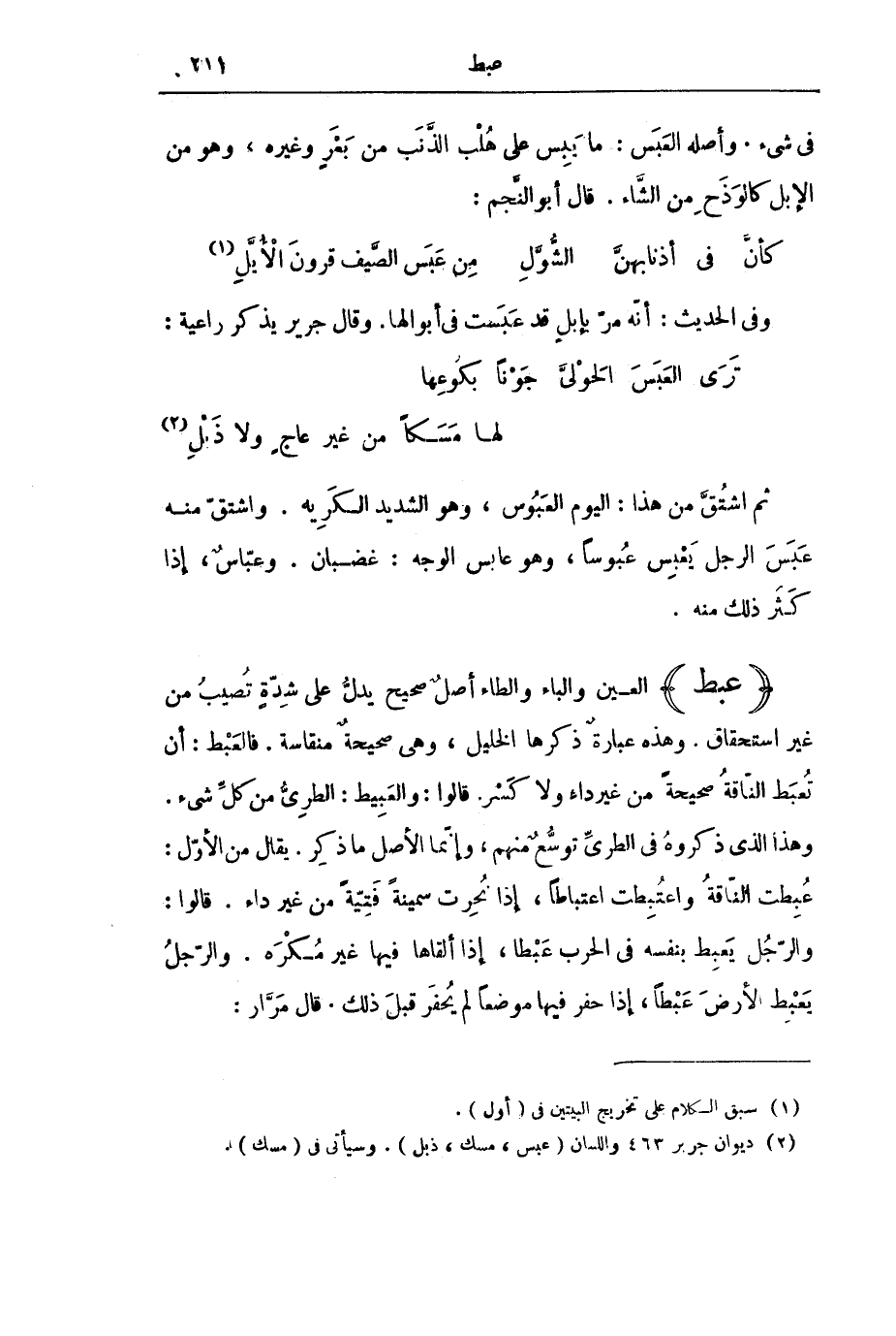 وَفِي الْحَدِيثِ: أَنَّهُ مَرَّ بِإِبِلٍ قَدْ عَبَسَتْ فِي أَبْوَالِهَا. وَقَالَ جَرِيرٌ يَذْكُرُ رَاعِيَةً: