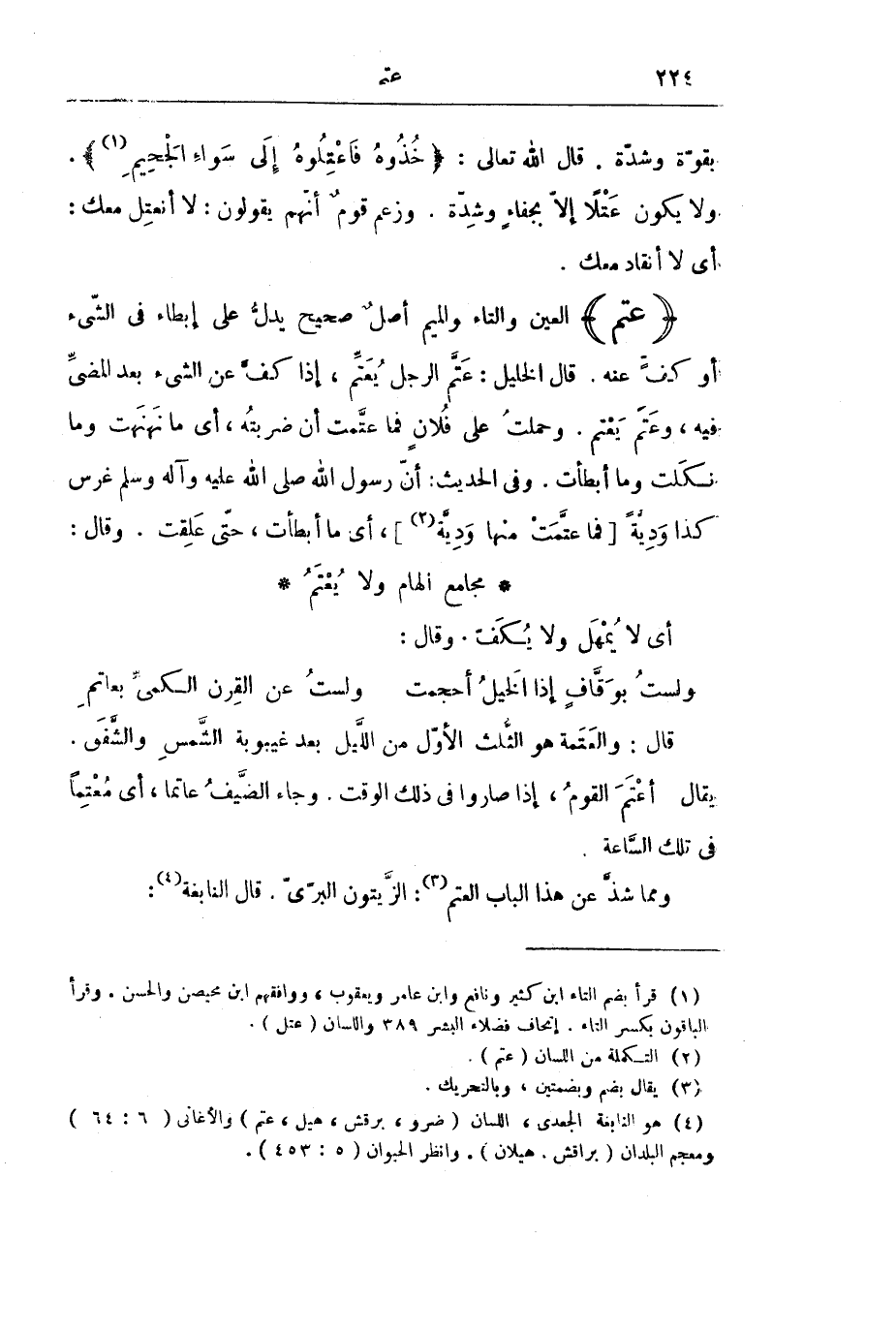 وَمِمَّا شَذَّ عَنْ هَذَا الْبَابِ الْعَتْمُ: الزَّيْتُونُ الْبَرِّيُّ. قَالَ النَّابِغَةُ: