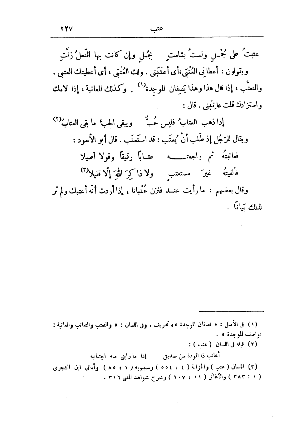وَقَالَ بَعْضُهُمْ: مَا رَأَيْتُ عِنْدَ فُلَانٍ عُتْبَانًا، إِذَا أَرَدْتَ أَنَّهُ أَعْتَبَكَ وَلَمْ تَرَ لِذَلِكَ بَيَانًا.