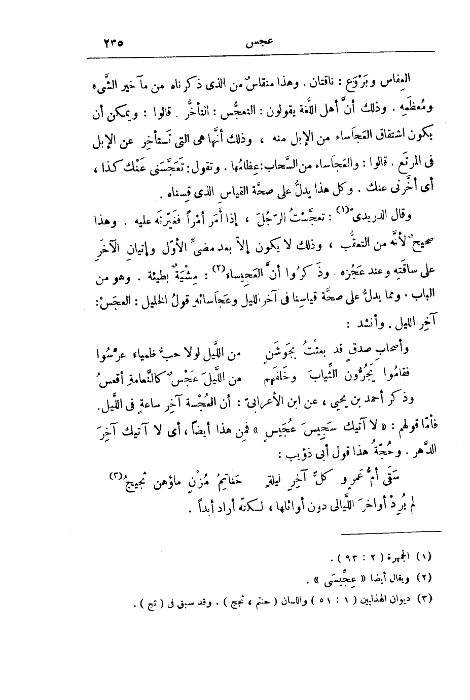 وَذَكَرَ أَحْمَدُ بْنُ يَحْيَى، عَنِ ابْنِ الْأَعْرَابِيِّ: أَنَّ الْعُجْسَةَ آخِرُ سَاعَةٍ فِي اللَّيْلِ. فَأَمَّا قَوْلُهُمْ: " وَلَا آتِيكَ سَجِيسَ عُجَيْسٍ " فَمِنْ هَذَا أَيْضًا، أَيْ لَا آتِيكَ آخِرَ الدَّهْرِ. وَحُجَّةُ هَذَا قَوْلُ أَبِي ذُؤَيْبٍ: