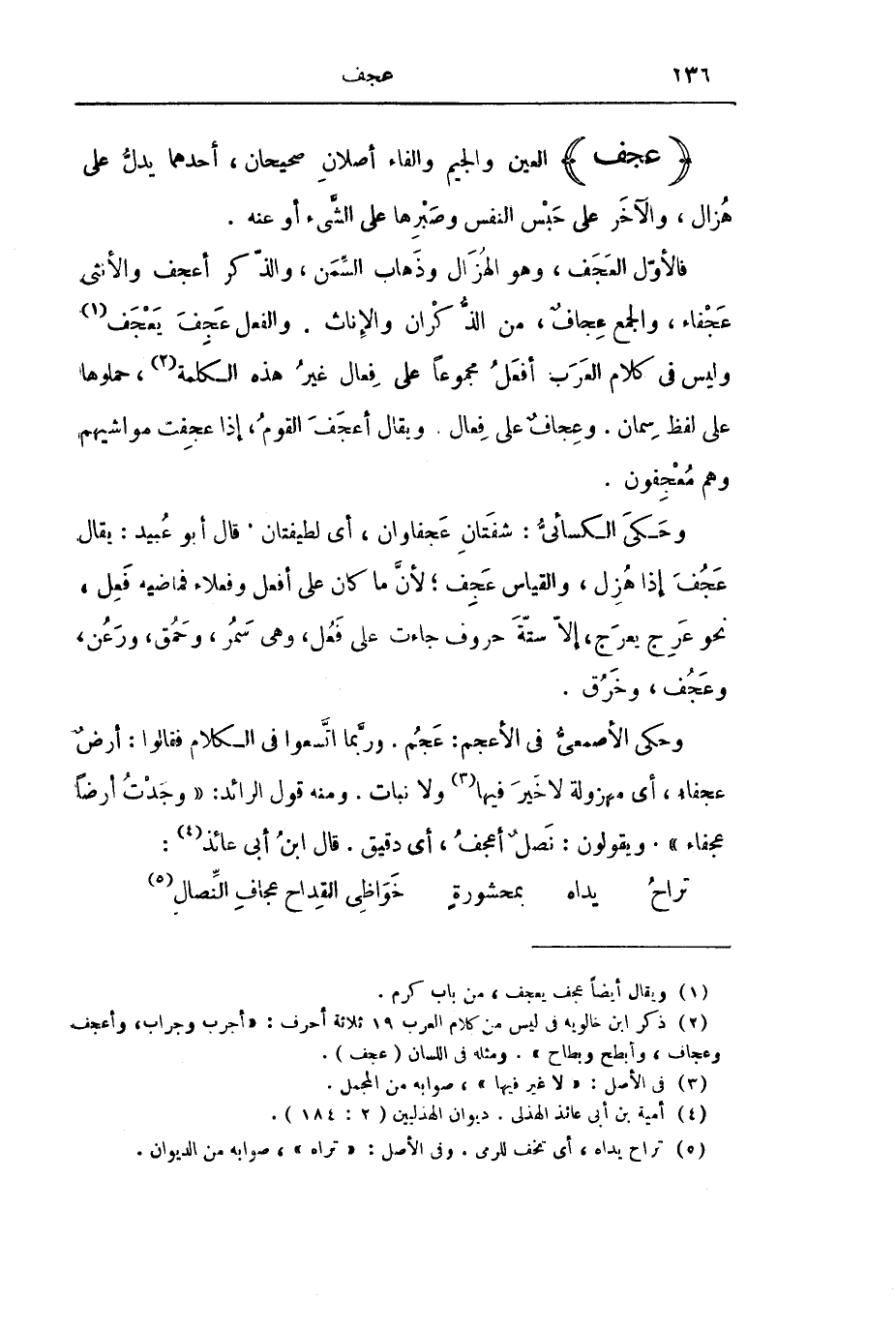 وَحَكَى الْكِسَائِيُّ: شَفَتَانِ عَجْفَاوَانِ، أَيْ لَطِيفَتَانِ قَالَ أَبُو عُبَيْدٍ: يُقَالُ عَجُفَ إِذَا هَزُلَ، وَالْقِيَاسُ عَجِفَ; لِأَنَّ مَا كَانَ عَلَى أَفْعَلَ وَفَعْلَاءَ فَمَاضِيهِ فَعِلَ، نَحْوَ عَرِجَ يَعْرَجُ، إِلَّا سِتَّةَ حُرُوفٍ جَاءَتْ عَلَى فَعُلَ، وَهِيَ سَمُرَ، وَحَمُقَ، وَرَعُنَ، وَعَجُفَ، وَخَرُقَ.