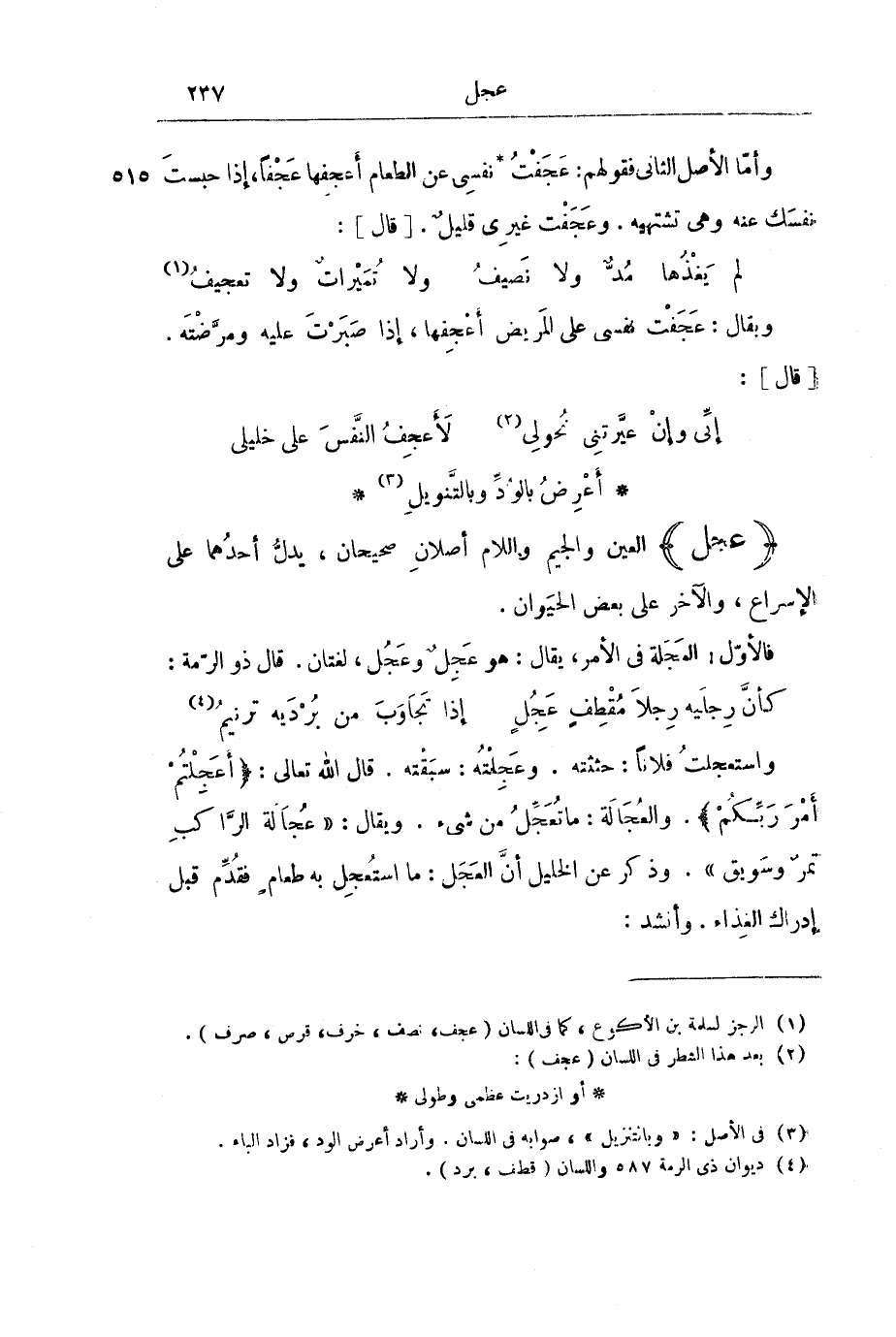 فَالْأَوَّلُ: الْعَجَلَةُ فِي الْأَمْرِ، يُقَالُ: هُوَ عَجِلٌ وَعَجُلٌ، لُغَتَانِ. قَالَ ذُو الرُّمَّةِ: