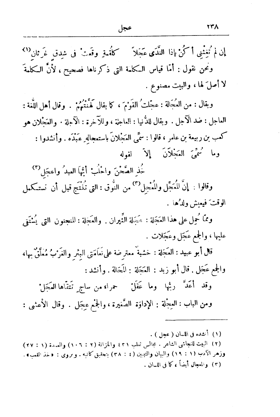 وَيُقَالُ: مِنَ الْعُجَالَةِ: عَجَلْتُ الْقَوْمَ، كَمَا يُقَالُ لَهَّنْتُهُمْ. وَقَالَ أَهْلُ اللُّغَةِ: الْعَاجِلُ: ضِدَّ الْآجِلِ. وَيُقَالُ لِلدُّنْيَا: الْعَاجِلَةُ، وَلِلْآخِرَةِ: الْآجِلَةُ. وَالْعَجْلَانُ هُوَ كَعْبُ بْنُ رَبِيعَةَ بْنِ عَامِرٍ، قَالُوا: سُمِّي الْعَجْلَانَ بِاسْتِعْجَالِهِ عَبْدَهُ. وَأَنْشَدُوا:
