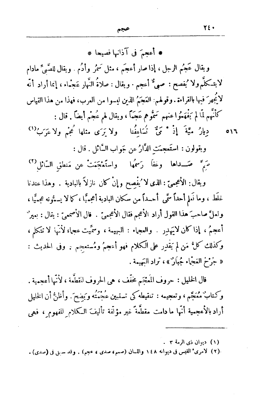 وَيُقَالُ: الْأَعْجَمِيُّ: الَّذِي لَا يُفْصِحُ وَإِنْ كَانَ نَازِلًا بِالْبَادِيَةِ. وَهَذَا عِنْدَنَا غَلَطٌ، وَمَا نَعْلَمُ أَحَدًا سَمَّى أَحَدًا مِنْ سُكَّانِ الْبَادِيَةِ أَعْجَمِيًّا، كَمَا لَا يُسَمُّونَهُ عَجَمِيًّا، وَلَعَلَّ صَاحِبَ هَذَا الْقَوْلِ أَرَادَ الْأَعْجَمَ فَقَالَ الْأَعْجَمِيَّ. قَالَ الْأَصْمَعِيُّ: يُقَالُ: بَعِيرٌ أَعْجَمُ، إِذَا كَانَ لَا يَهْدِرُ. وَالْعَجْمَاءُ: الْبَهِيمَةُ، وَسُمِّيَتْ عَجْمَاءَ لِأَنَّهَا لَا تَتَكَلَّمُ، وَكَذَلِكَ كُلُّ مَنْ لَمْ يَقْدِرْ عَلَى الْكَلَامِ فَهُوَ أَعْجَمُ وَمُسْتَعْجِمٌ. وَفِي الْحَدِيثِ: «جُرْحُ الْعَجْمَاءِ جُبَارٌ» ، تُرَادُ الْبَهِيمَةُ.