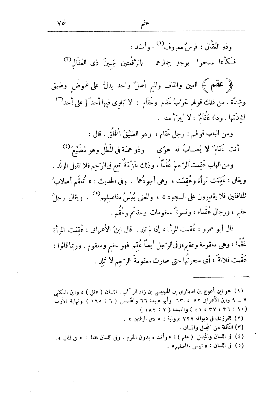 قَالَ أَبُو عَمْرٍو: عُقِمَتِ الْمَرْأَةُ، إِذَا لَمْ تَلِدْ. قَالَ ابْنُ الْأَعْرَابِيِّ: عُقِمَتِ الْمَرْأَةُ عَقْمًا، وَهِيَ مَعْقُومَةٌ وَعَقِيمٌ، وَفِي الرَّجُلِ أَيْضًا عُقِمَ فَهُوَ عَقِيمٌ وَمَعْقُومٌ. وَرُبَّمَا قَالُوا: عَقَمْتُ فُلَانَةَ، أَيْ سَحَرْتُهَا حَتَّى صَارَتْ مَعْقُومَةَ الرَّحِمِ لَا تَلِدُ.