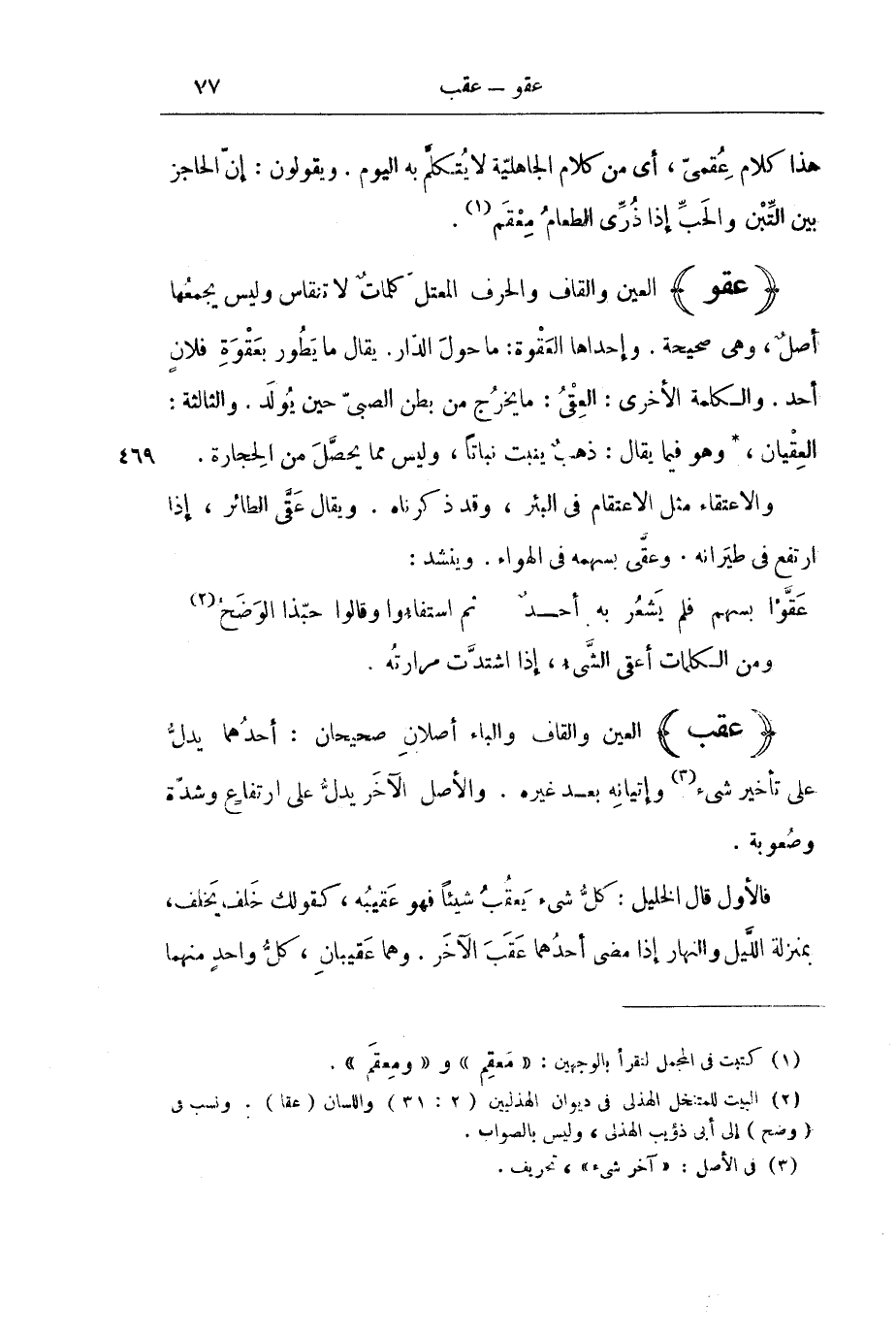 فَالْأَوَّلُ قَالَ الْخَلِيلُ: كُلُّ شَيْءٍ يَعْقُبُ شَيْئًا فَهُوَ عَقِيبُهُ، كَقَوْلِكَ خَلَفَ يَخْلُفُ، بِمَنْزِلَةِ اللَّيْلِ وَالنَّهَارِ إِذَا مَضَى أَحَدُهُمَا عَقَبَ الْآخَرِ. وَهُمَا عَقِيبَانِ، كُلُّ وَاحِدٍ مِنْهُمَا