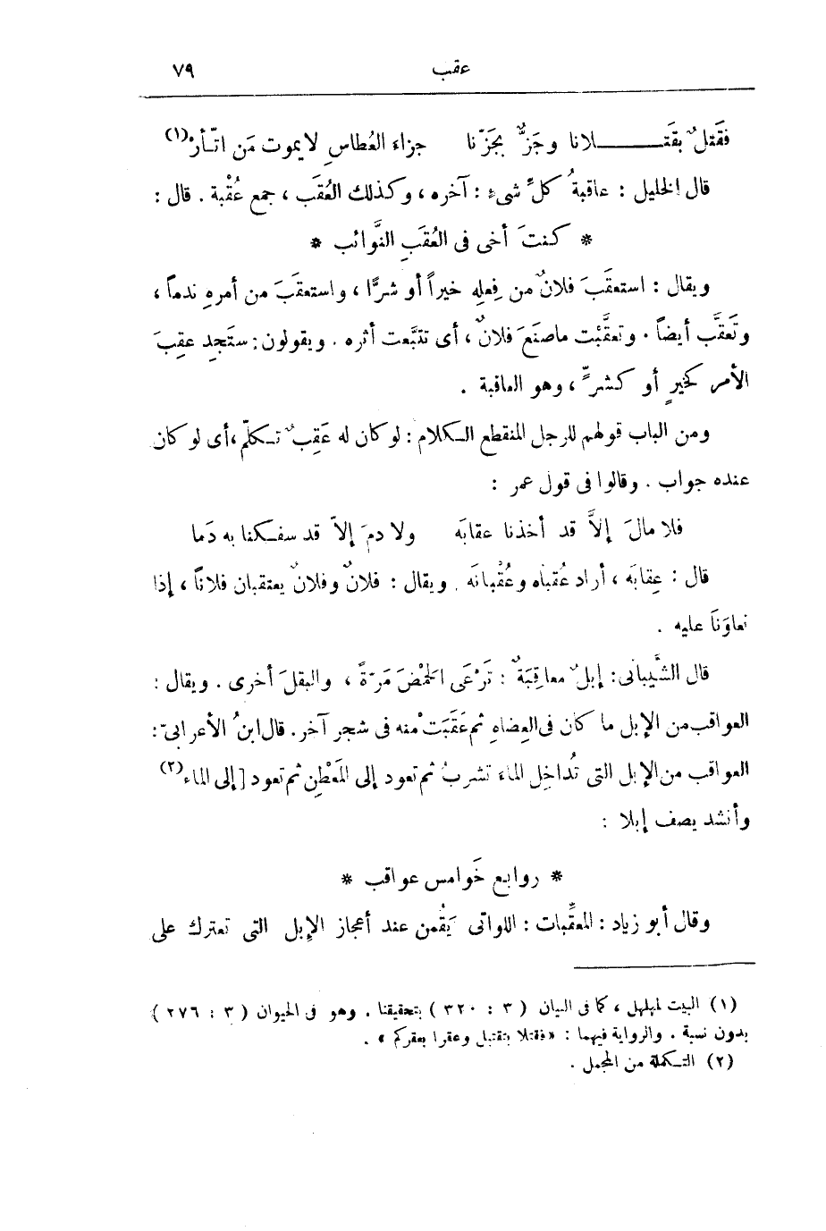 قَالَ الشَّيْبَانِيُّ: إِبِلٌ مُعَاقِبَةٌ: تَرْعَى الْحَمْضَ مَرَّةً، وَالْبَقْلَ أُخْرَى. وَيُقَالُ: الْعَوَاقِبُ مِنَ الْإِبِلِ مَا كَانَ فِي الْعِضَاهِ ثُمَّ عَقَبَتْ مِنْهُ فِي شَجَرٍ آخَرَ. قَالَ ابْنُ الْأَعْرَابِيِّ: الْعَوَاقِبُ مِنَ الْإِبِلِ الَّتِي تُدَاخِلُ الْمَاءَ تَشْرَبُ ثُمَّ تَعُودُ إِلَى الْمَعْطِنِ ثُمَّ تَعُودُ إِلَى الْمَاءِ وَأَنْشَدَ يَصِفُ إِبِلًا: