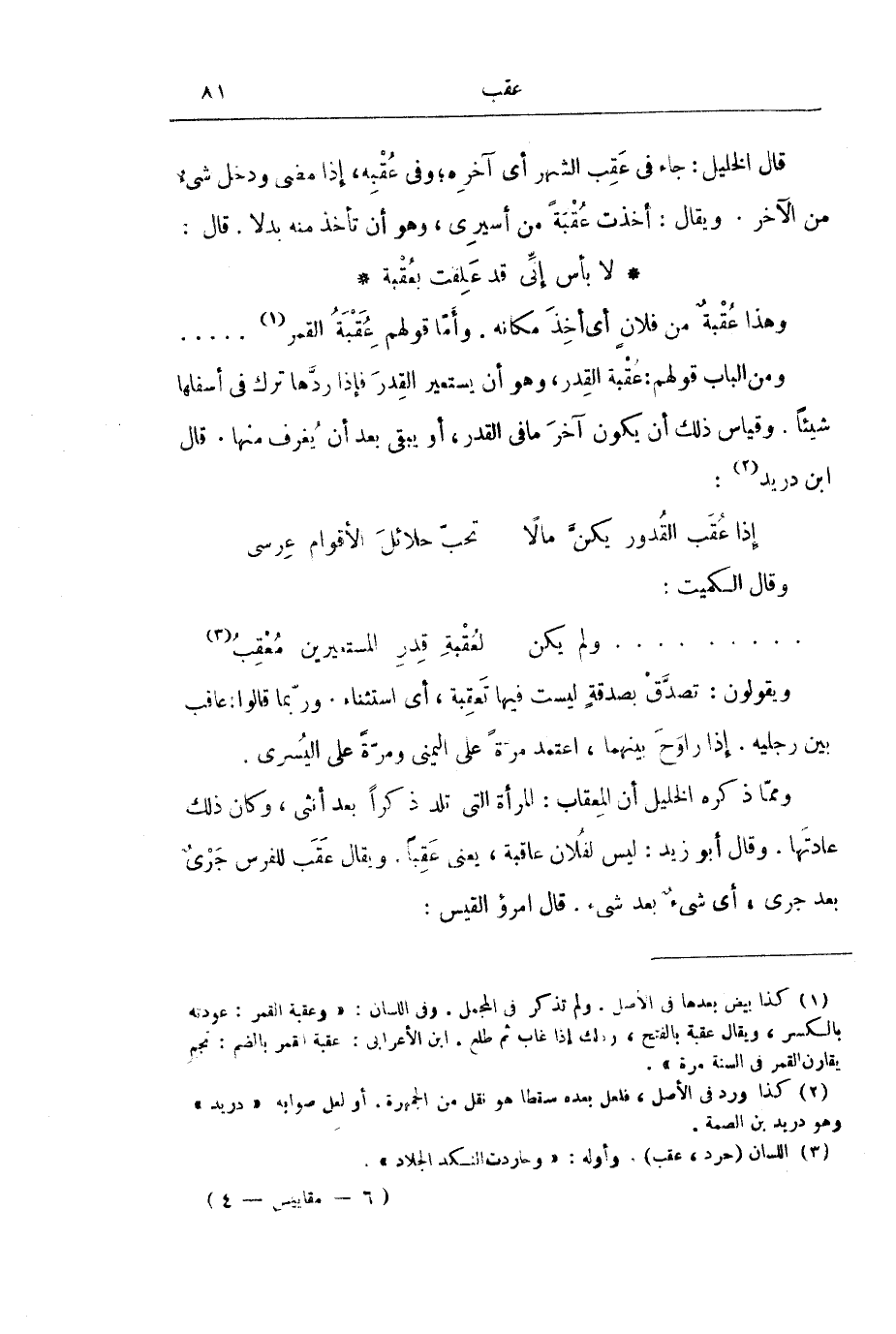 وَهَذَا عُقْبَةٌ مِنْ فُلَانٍ أَيْ أُخِذَ مَكَانَهُ. وَأَمَّا قَوْلُهُمْ عُقْبَةُ الْقَمَرِ. . . . . . . .