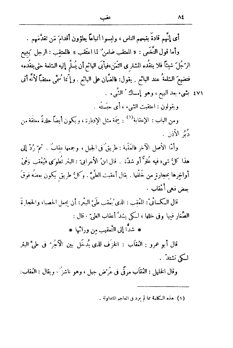 وَأَمَّا الْأَصْلُ الْآخَرُ فَالْعَقَبَةُ: طَرِيقٌ فِي الْجَبَلِ، وَجَمْعُهَا عِقَابٌ. ثُمَّ رُدَّ إِلَى هَذَا كُلُّ شَيْءٍ فِيهِ عُلُوٌّ أَوْ شِدَّةٌ. قَالَ ابْنُ الْأَعْرَابِيِّ: الْبِئْرُ تُطْوَى فَيُعْقَبُ وَهْيُ أَوَاخِرُهَا بِحِجَارَةٍ مِنْ خَلْفِهَا. يُقَالُ أَعْقَبْتُ الطَّيَّ. وَكُلُّ طَرِيقٍ يَكُونُ بَعْضُهُ فَوْقَ بَعْضٍ فَهِيَ أَعْقَابٌ.
