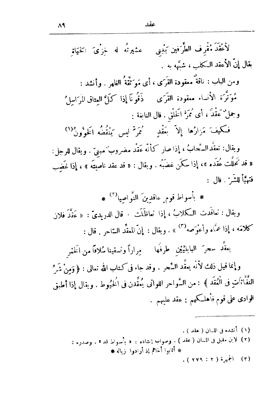 وَإِنَّمَا قِيلَ ذَلِكَ لِأَنَّهُ يُعَقِّدُ السِّحْرَ. وَقَدْ جَاءَ فِي كِتَابِ اللَّهِ - تَعَالَى: {وَمِنْ شَرِّ النَّفَّاثَاتِ فِي الْعُقَدِ} [الفلق: 4] : مِنَ السَّوَاحِرِ اللَّوَاتِي يُعَقِّدْنَ فِي الْخُيُوطِ. وَيُقَالُ إِذَا أَطْبَقَ الْوَادِي عَلَى قَوْمٍ فَأَهْلَكَهُمْ: عَقَدَ عَلَيْهِمْ.