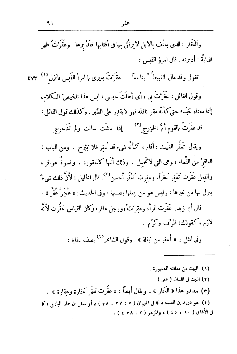 وَقَوْلُ الْقَائِلِ: عَقَرْتَ بِي، أَيْ أَطَلْتَ حَبْسِي، لَيْسَ هَذَا تَلْخِيصَ الْكَلَامِ، إِنَّمَا مَعْنَاهُ حَبَسَهُ حَتَّى كَأَنَّهُ عَقَرَ نَاقَتَهُ فَهُوَ لَا يَقْدِرُ عَلَى السَّيْرِ. وَكَذَلِكَ قَوْلُ الْقَائِلِ:
