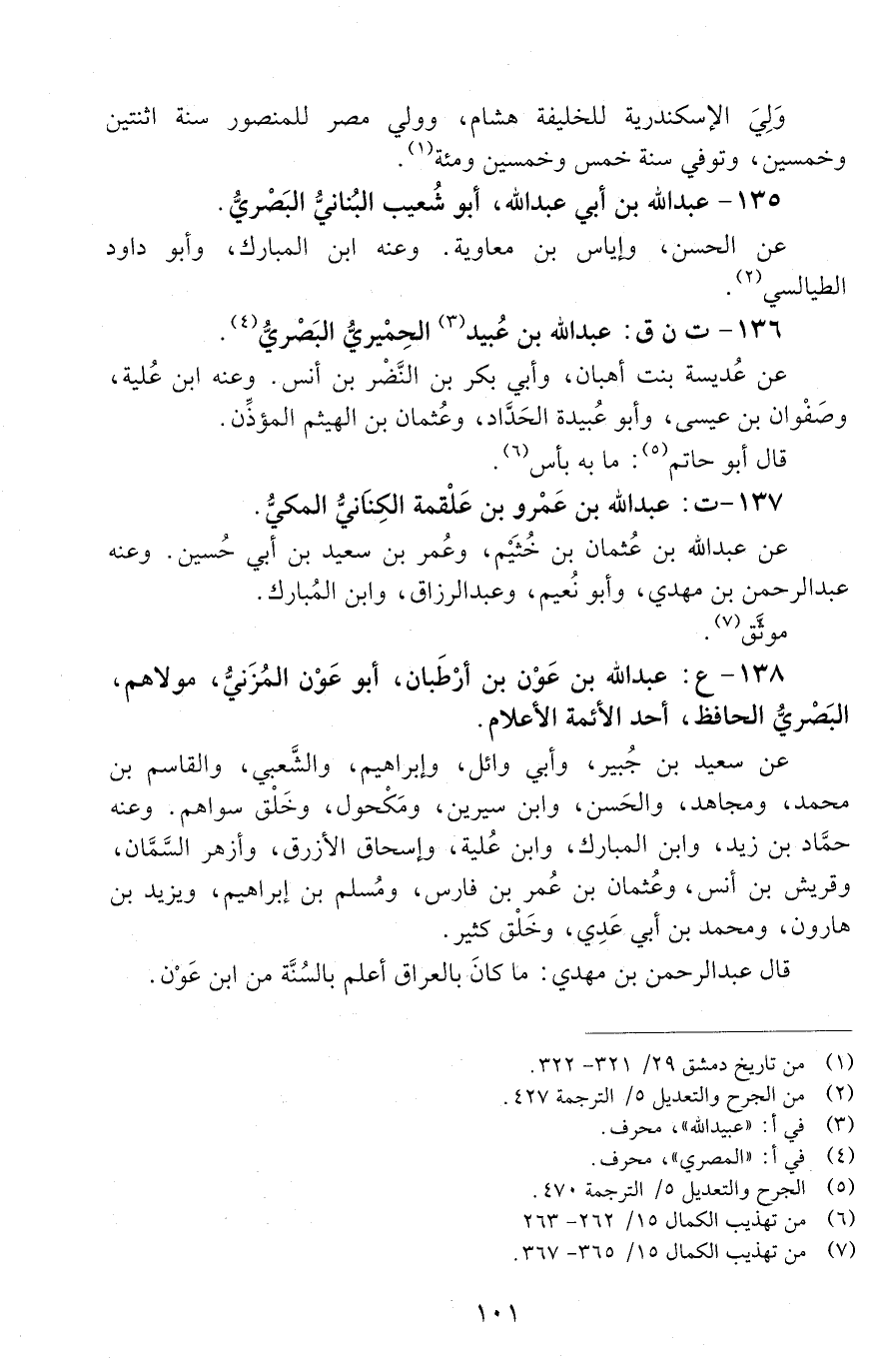 138 - ع: عَبْد الله بْن عون بْن أرْطَبان أَبُو عَوْن المُزَنيُّ مولاهم البَصْريُّ الحافظ [الوفاة: 151 - 160 ه]