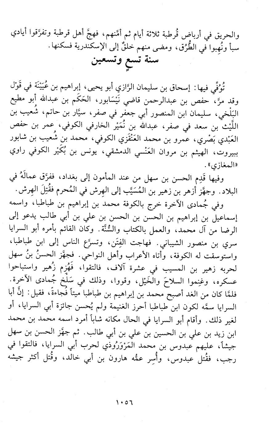 وفيها قِدم الحَسَن بْن سهل مِن عند المأمون إلى بغداد، ففرّق عماله في البلاد، وجهّز أزهر بْن زهير بْن المسيّب إلى الهِرش في المحرَّم فقتل الهِرش.