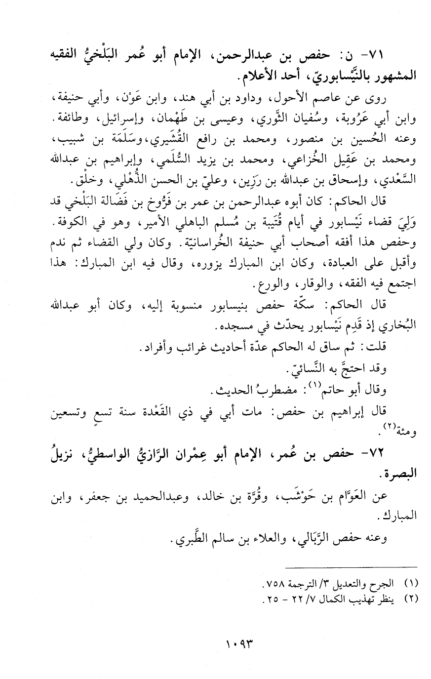 71 - ن: حفص بن عبد الرحمن، الإمام أبو عُمَر البلْخيُّ الفقيه، المشهور بالنَّيْسابوريّ، [الوفاة: 191 - 200 ه]