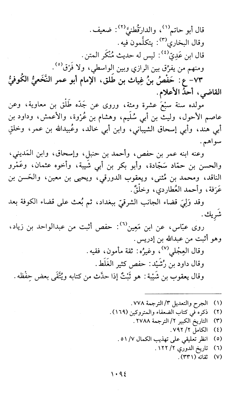 73 - ع: حَفْصُ بْن غياث بْن طَلْق، الإمام أبو عُمَر النخعي الكوفي القاضي، [الوفاة: 191 - 200 ه]