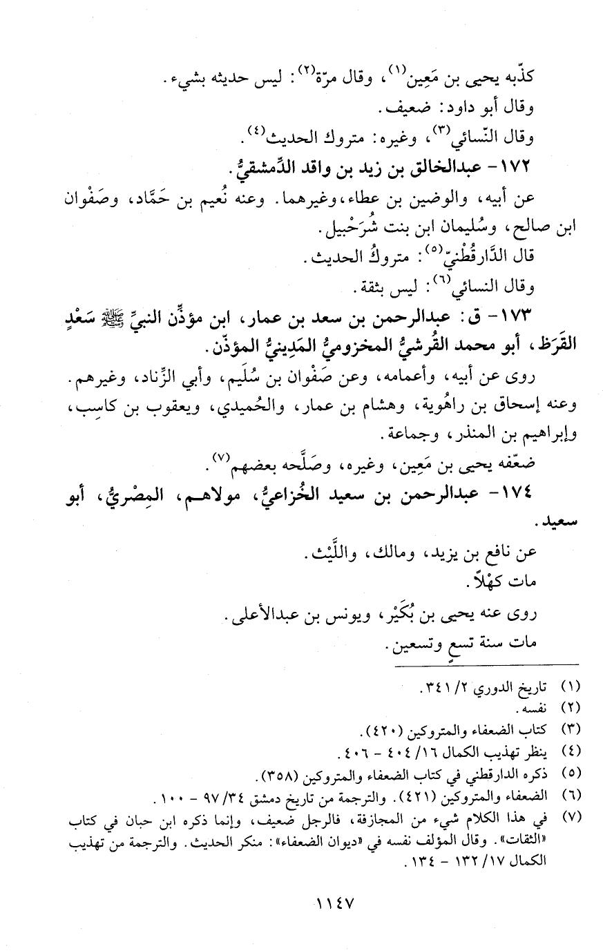 173 - ق: عَبْد الرَّحْمَن بْن سعْد بْن عمّار، ابن مؤذَّن النَّبِيّ صَلَّى اللهُ عَلَيْهِ وَسَلَّمَ سعْد القَرِظ، أبو محمد الْقُرَشِيّ المخزوميُّ المَدِينيّ المؤذِّن. [الوفاة: 191 - 200 ه]