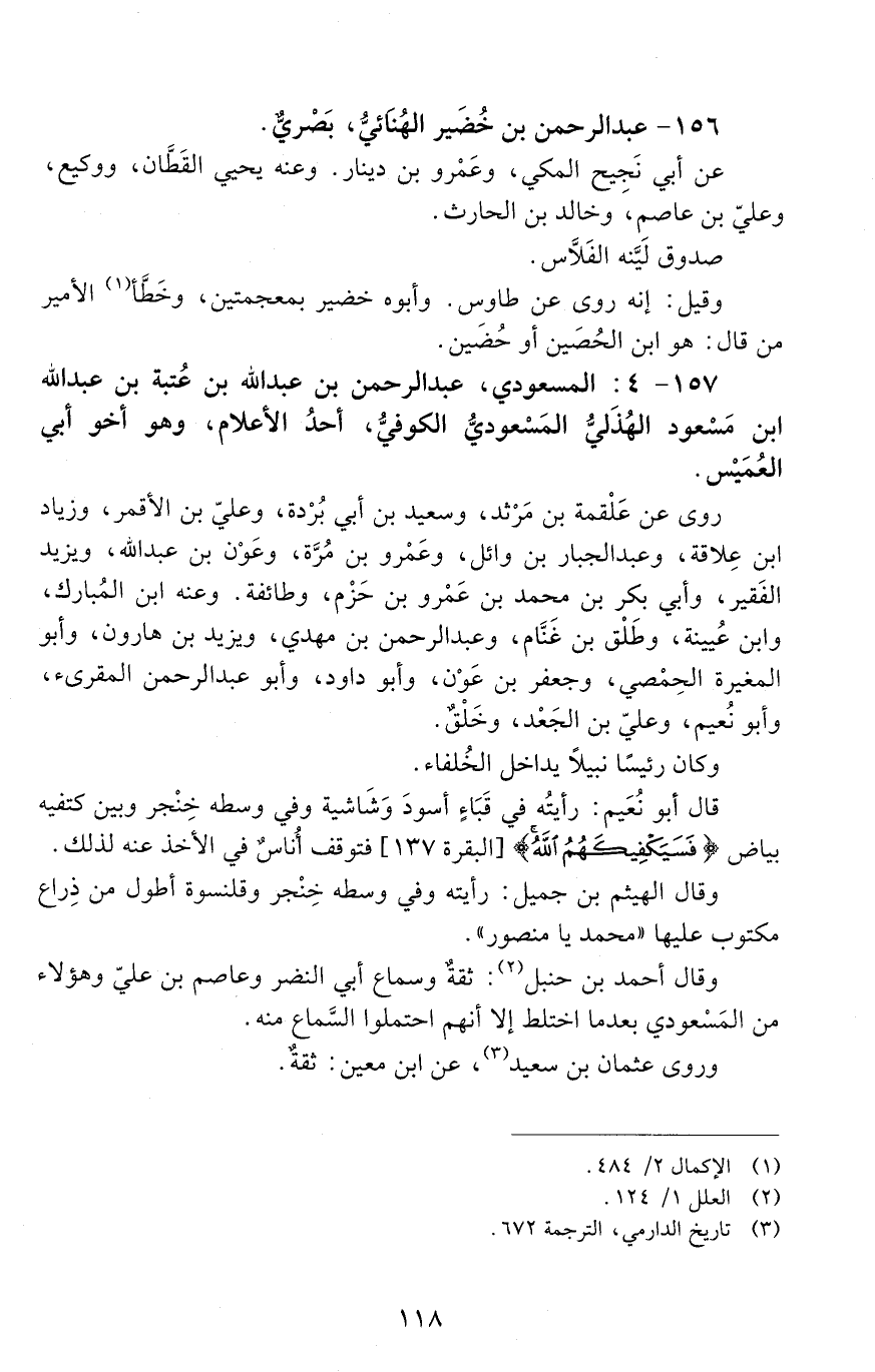 157 - 4: المسعودي: عَبْد الرحمن بْن عَبْد اللَّهِ بْن عُتْبَةَ بْن عَبْد الله بْن مسعود الهُذْليّ المَسْعوديُّ الكوفيُّ، [الوفاة: 151 - 160 ه]