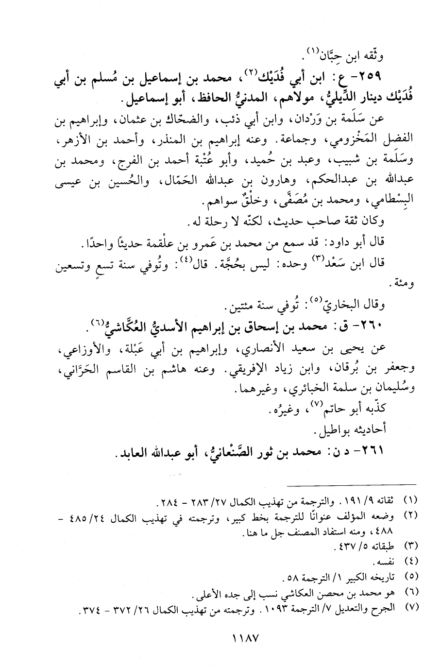 259 - ع: ابن أبي فديك، محمد بْن إسماعيل بْن مسلم بْن أَبِي فُدَيْك دينار الدِّيليُّ مولاهم المدنيُّ الحافظ، أبو إسماعيل. [الوفاة: 191 - 200 ه]