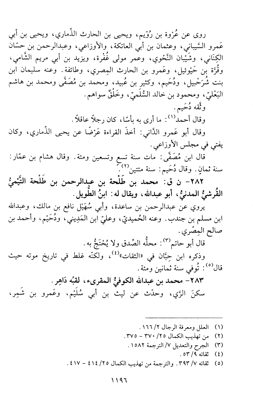 282 - ن ق: محمد بْن طلحة بْن عَبْد الرَّحْمَن بْن طلحة التَّيْميّ الْقُرَشِيّ المدنيُّ أبو عَبْد الله، ويقال لَهُ ابن الطَّوِيلِ. [الوفاة: 191 - 200 ه]