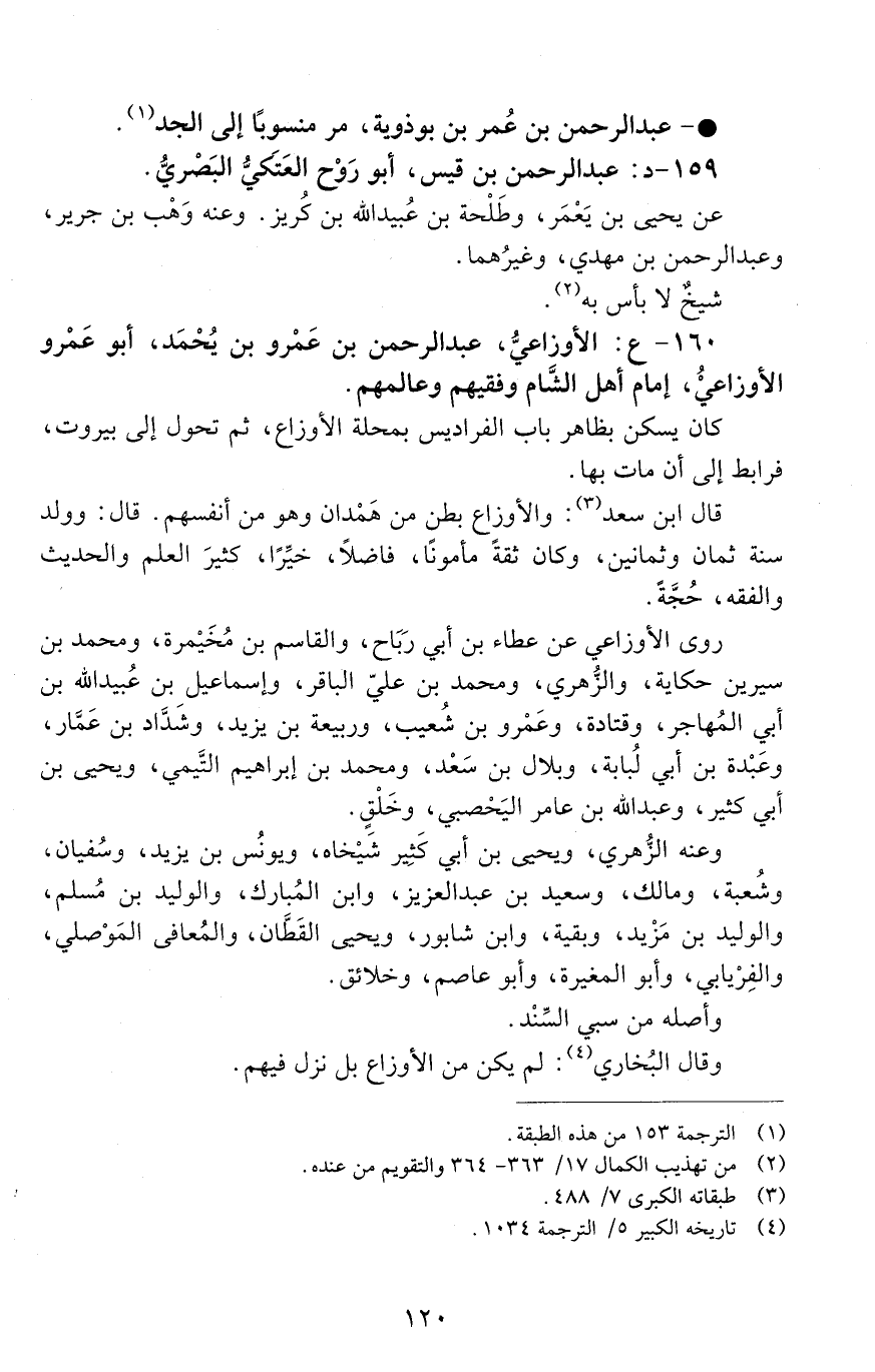 160 - ع: الأوزاعيُّ عَبْد الرحمن بْن عمرو بْن يُحْمَد أَبُو عَمْرو الأوزاعيُّ، [الوفاة: 151 - 160 ه]