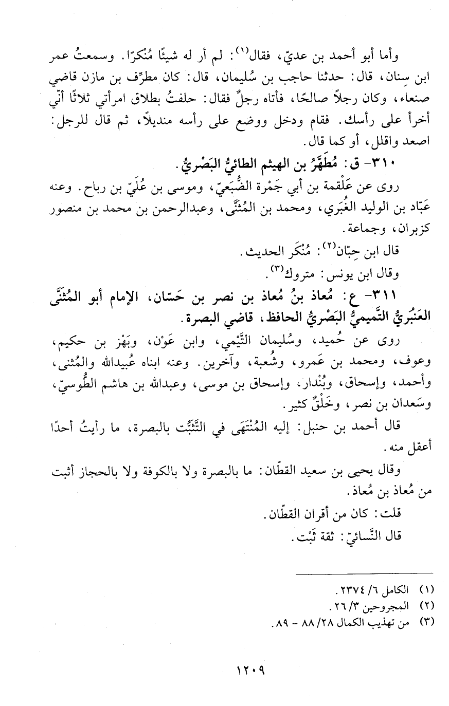 311 - ع: مُعَاذ بْن مُعَاذ بْن نصر بْن حَسَّان الإمام أبو المُثَنَّى العنبري التميمي البَصْريُّ الحافظ، [الوفاة: 191 - 200 ه]