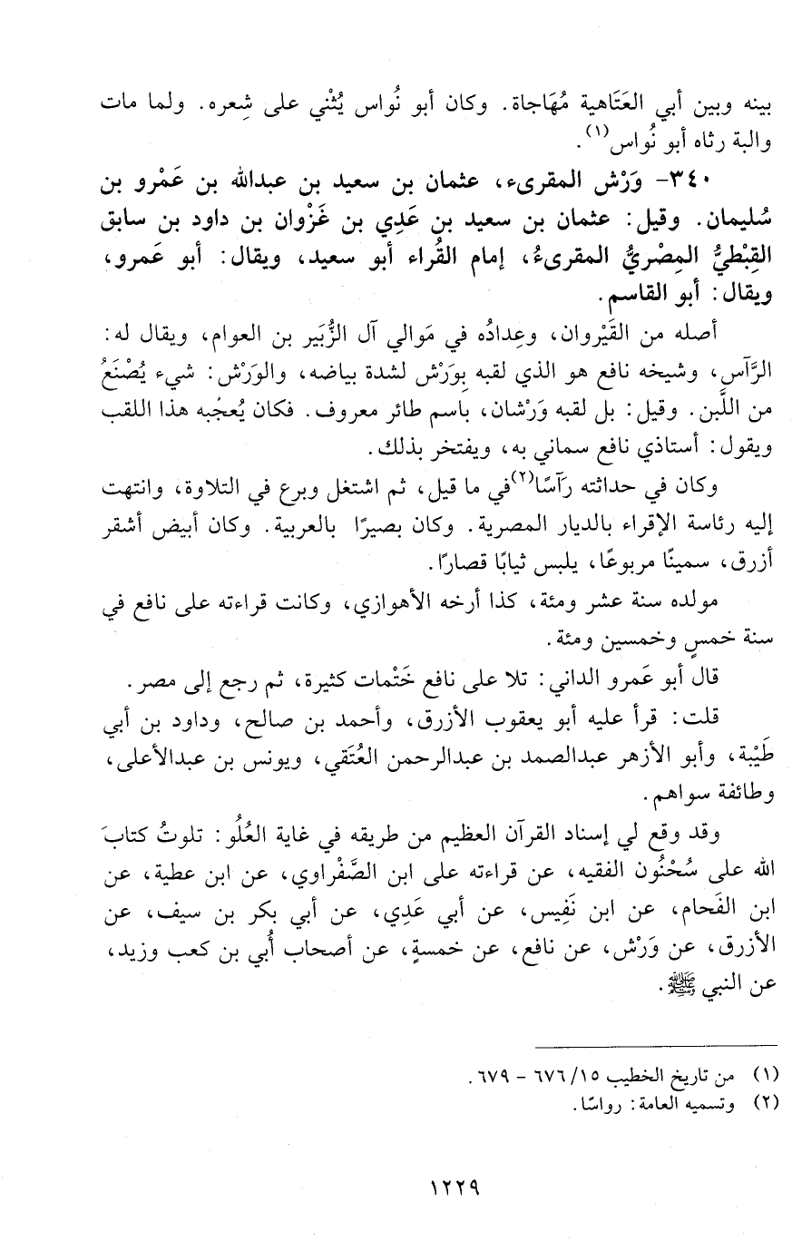 340 - وَرْش المقرئ، عثمان بْن سَعِيد بْن عبد الله بْن عَمْرو بْن سليمان. وقيل: عثمان بْن سَعِيد بْن عَدِيّ بْن غَزْوان بْن داود بْن سابق القِبطيُّ الْمَصْرِيّ المقرئ، إمام القُرّاء أبو سَعِيد، ويقال: أبو عمرو، ويقال: أبو القاسم. [الوفاة: 191 - 200 ه]