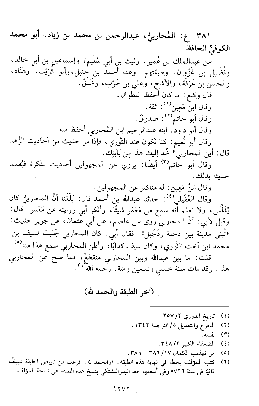 381 - ع: المُحَاربيّ، عَبْد الرَّحْمَن بْن محمد بْن زياد، أبو محمد الكوفيُّ الحافظ. [الوفاة: 191 - 200 ه]
