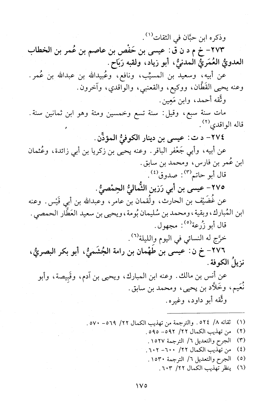 273 - خ م د ن ق: عيسى بْن حَفْصُ بْنُ عَاصِمِ بْنِ عُمَرَ بْنِ الْخَطَّابِ العدويُّ العُمَريُّ المدنيُّ، أَبُو زياد، ولقبه رَبَاح. [الوفاة: 151 - 160 ه]