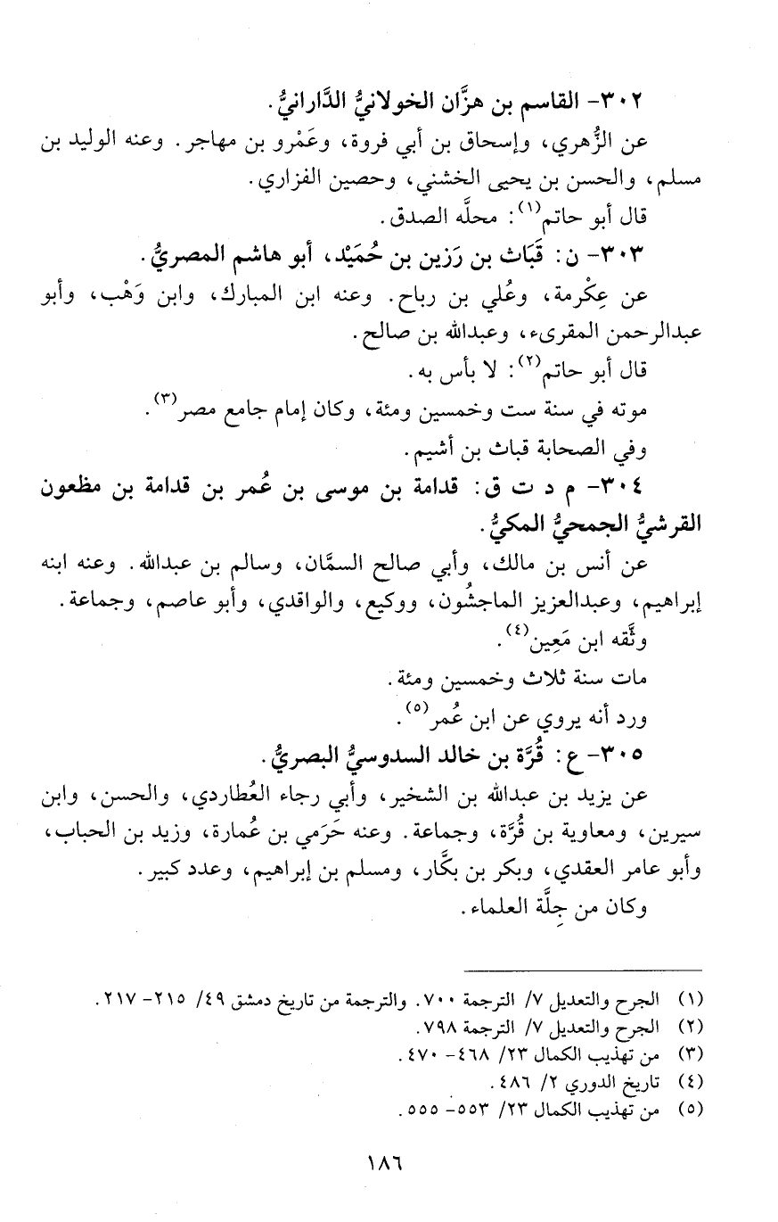 304 - م د ت ق: قدامة بْن موسى بْن عُمر بْن قدامة بْن مظعون القُرَشِيُّ الجمحيُّ المكِّيُّ. [الوفاة: 151 - 160 ه]