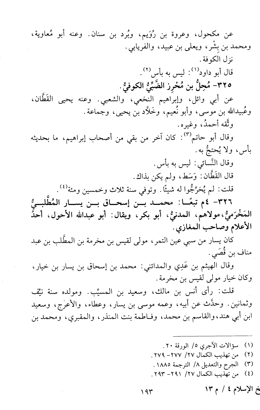 326 - 4 م تبعاً: محمد بْن إسحاق بْن يسار المُطَّلبيُّ المَخْرَميُّ مولاهم الْمَدَنِيّ أَبُو بكر، ويقال: أَبُو عَبْد الله الأحول [الوفاة: 151 - 160 ه]
