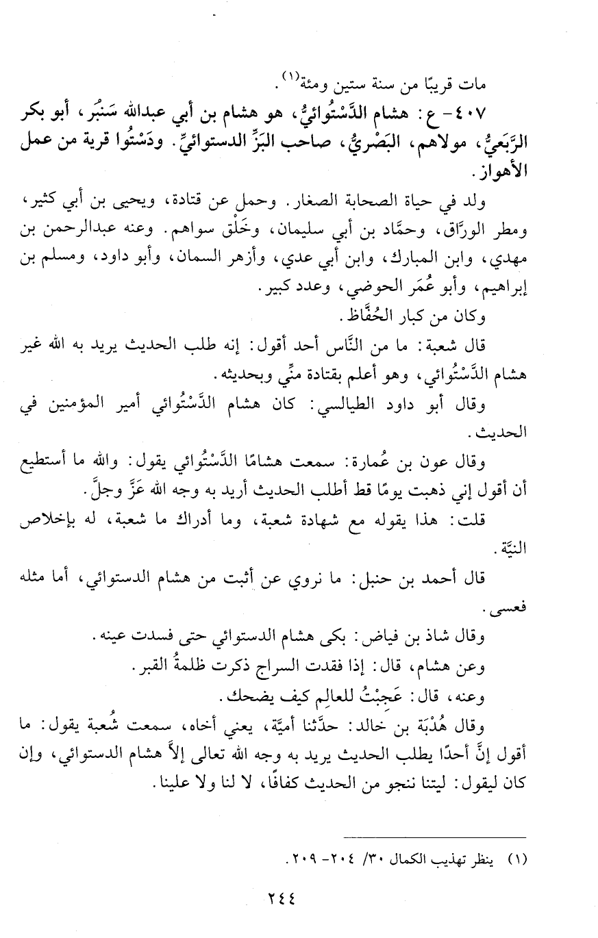 407 - ع: هشام الدَّسْتُوائيُّ هُوَ هشام بْن أَبِي عَبْد الله سَنْبَر أَبُو بكر الرَّبَعيُّ مولاهم، البَصْريُّ، صاحب البَزِّ الدستوائيِّ. [الوفاة: 151 - 160 ه]
