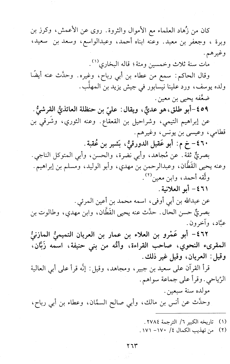 462 - أَبُو عمرو بْن العلاء بْن عمار بْن العريان التميمي الْمَازِنِيِّ الْمُقْرِئ النحوي، صاحب القراءة، وأمه من بني حنيفة، اسمه زبان، وقيل: العريان، [الوفاة: 151 - 160 ه]