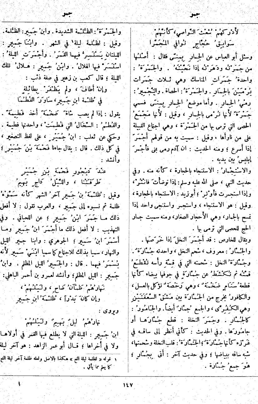 ؛ هُوَ جمعُ جُمَّارة. والجَمْرَةُ: الظُّلْمة الشَّدِيدَةُ. وابنُ جَمِير: الظُّلمة. وَقِيلَ: لظُلمة لَيْلَةٍ «1». فِي الشَّهْرِ. وابْنَا جَمِيرٍ: الليلتانِ يَسْتَسِرُّ فِيهِمَا القَمَرُ. وأَجْمَرَتِ الليلةُ: اسْتَسَرَّ فِيهَا الهلالُ. وابْنُ جَمِيرٍ: هلالُ تِلْكَ اللَّيْلَةِ: قَالَ كَعْبُ بْنُ زُهَيْرٍ فِي صِفَةِ ذِئْبٍ:
