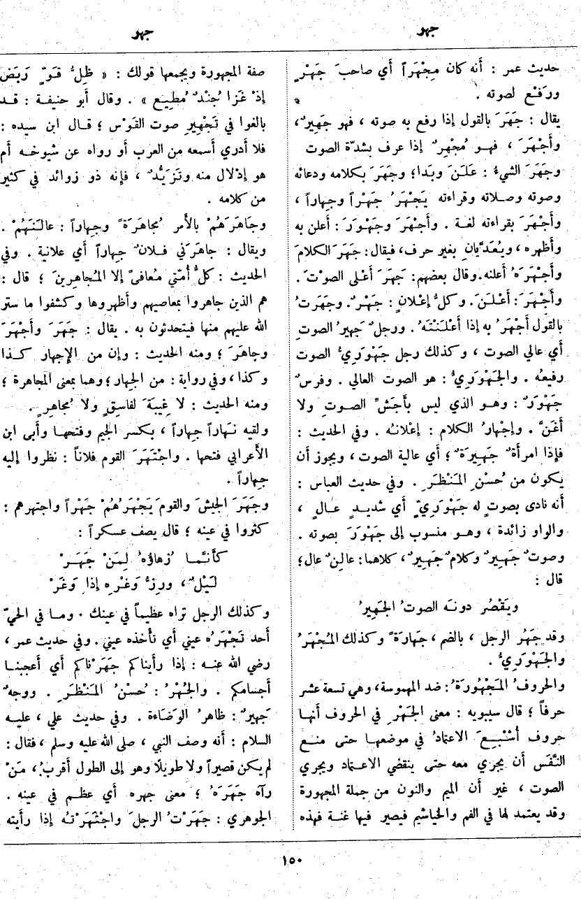 وَقَدْ جَهُر الرَّجُلُ، بِالضَّمِّ، جَهَارَةً وَكَذَلِكَ المُجْهَرُ والجَهْورِيُّ. والحروفُ المَجْهُورَةُ: ضِدُّ الْمَهْمُوسَةِ: وَهِيَ تِسْعَةَ عَشَرَ حَرْفًا؛ قَالَ سِيبَوَيْهِ: مَعْنَى الجَهْرِ فِي الْحُرُوفِ أَنها حُرُوفٌ أُشْبِعَ الاعتمادُ فِي مَوْضِعِهَا حَتَّى مَنَعَ النَّفَس أَن يَجْرِيَ مَعَهُ حَتَّى يَنْقَضِيَ الِاعْتِمَادُ وَيَجْرِي الصَّوْتُ، غَيْرَ أَن الْمِيمَ وَالنُّونَ مِنْ جُمْلَةِ الْمَجْهُورَةِ وَقَدْ يُعْتَمَدُ لَهَا فِي الْفَمِ وَالْخَيَاشِيمِ فَيَصِيرُ فِيهَا غُنَّةٌ فَهَذِهِ صِفَةُ الْمَجْهُورَةِ وَيَجْمَعُهَا قَوْلُكَ: [ظِلُّ قَوٍّ رَبَض إِذْ غَزَا جُنْدٌ مُطيع]. وَقَالَ أَبو حَنِيفَةَ: قَدْ بَالَغُوا فِي تَجْهِير صَوْتِ القَوْس؛ قَالَ ابْنُ سِيدَهْ: فَلَا أَدري أَسمعه مِنَ الْعَرَبِ أَو رَوَاهُ عَنْ شُيُوخِهِ أَم هُوَ إِدْلال مِنْهُ وتَزَيُّدٌ، فإِنه ذُو زَوَائِدٍ فِي كَثِيرٍ مِنْ كَلَامِهِ. وجَاهَرَهُمْ بالأَمر مُجاهَرَةً وجِهاراً: عالَنَهُمْ. وَيُقَالُ: جاهَرَني فلانٌ جِهاراً أَي عَلَانِيَةً. وَفِي الْحَدِيثِ:
