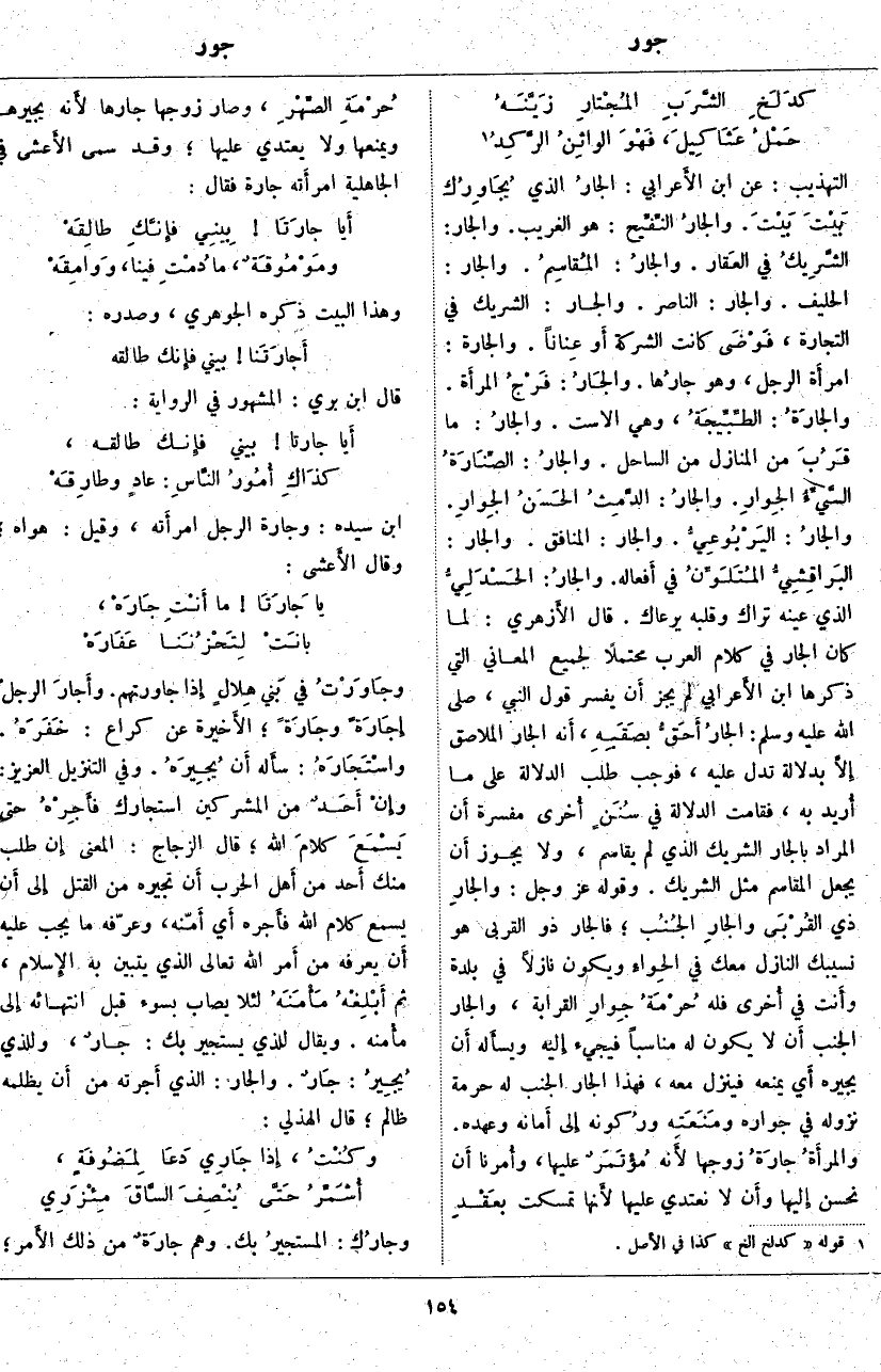 ؛ فَالْجَارُ ذُو الْقُرْبَى هُوَ نَسِيبُكَ النَّازِلُ مَعَكَ فِي الحِواءِ وَيَكُونُ نَازِلًا فِي بَلْدَةٍ وأَنت فِي أُخْرَى فَلَهُ حُرَمَةُ جِوارِ الْقُرَابَةِ، وَالْجَارُ الْجُنُبِ أَن لَا يَكُونُ لَهُ مُنَاسِبًا فَيَجِيءُ إِليه ويسأَله أَن يُجِيرَهُ أَي يَمْنَعُهُ فَيَنْزِلُ مَعَهُ، فَهَذَا الْجَارُ الْجُنُبُ لَهُ حُرْمَةُ نُزُولِهِ فِي جِوَارِهِ ومَنَعَتِه ورُكونه إِلى أَمانه وَعَهْدِهِ. والمرأَةُ جارَةُ زَوْجِهَا لأَنه مُؤْتَمَرٌ عَلَيْهَا، وأُمرنا أَن نُحْسِنَ إِليها وأَن لَا نَعْتَدِي عَلَيْهَا لأَنها تَمَسَّكَتْ بعَقْدِ حُرْمَةِ الصِّهْرِ، وَصَارَ زَوْجُهَا جَارُّهَا لأَنه يُجِيرُهَا وَيَمْنَعُهَا وَلَا يَعْتَدِي عَلَيْهَا؛ وَقَدْ سَمَّى الأَعشى فِي الْجَاهِلِيَّةِ امرأَته جَارَةً فَقَالَ: