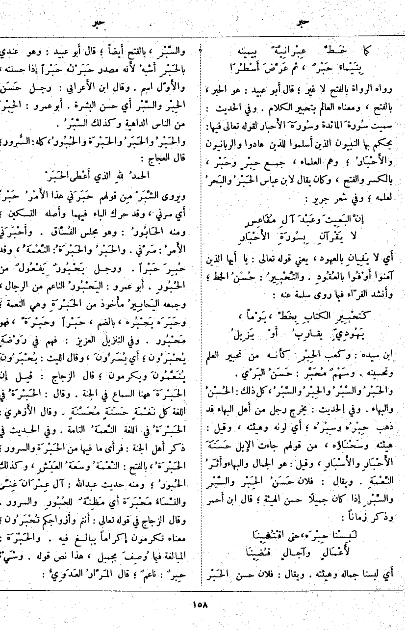 أَي لَبِسْنَا جَمَالَهُ وَهَيْئَتَهُ. وَيُقَالُ: فُلَانٌ حَسَنُ الحَبْر والسَّبْرِ، بِالْفَتْحِ أَيضاً؛ قَالَ أَبو عُبَيْدٍ: وَهُوَ عِنْدِي بالحَبْرِ أَشْبَهُ لأَنه مَصْدَرُ حَبَرْتُه حَبْراً إِذا حَسَّنْتَهُ، والأَوّل اسْمٌ. وَقَالَ ابْنُ الأَعرابي: رَجُلٌ حَسَنُ الحِبْر والسِّبْر أَي حَسَنُ الْبَشَرَةِ. أَبو عَمْرٍو: الحِبْرُ مِنَ النَّاسِ الدَّاهِيَةُ وَكَذَلِكَ السِّبْرُ. والحَبْرُ والحَبَرُ والحَبْرَة والحُبُور، كُلُّهُ: السُّرور؛ قَالَ الْعَجَّاجُ: