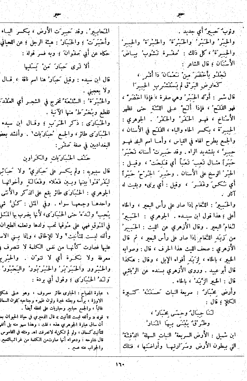 (2). عبارة المصباح: الحبارى طائر معروف، وهو على شكل الأوزة، برأسه وبطنه غبرة ولون ظهره وجناحيه كلون السماني غالباً، والجمع حبابير وحباريات على لفظه أَيضاً