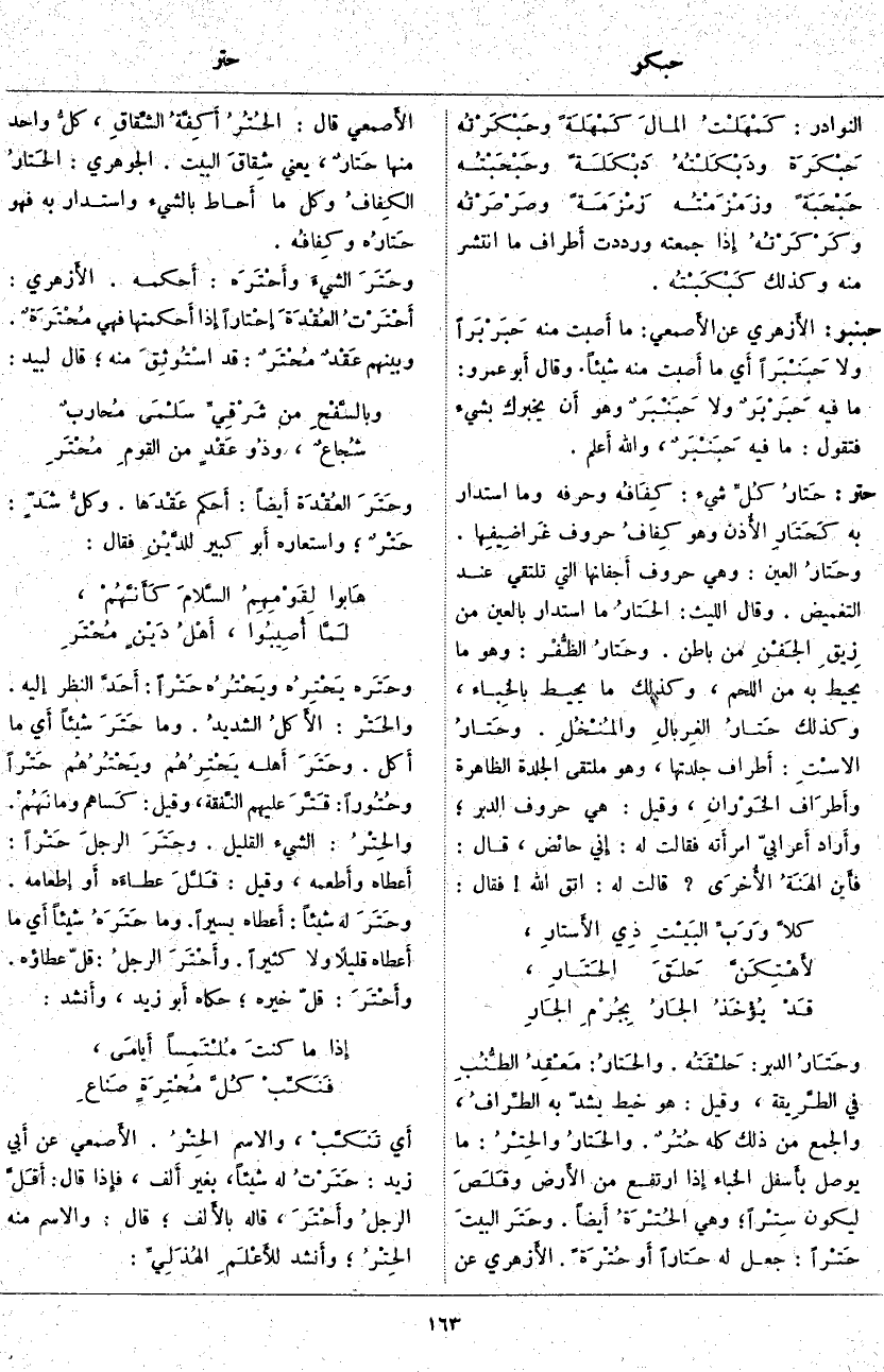 حبنبر: الأَزهري عَنِ الأَصمعي: مَا أَصبت مِنْهُ حَبَرْبَراً وَلَا حَبَنْبَراً أَي مَا أَصبت مِنْهُ شَيْئًا. وَقَالَ أَبو عَمْرٍو: مَا فِيهِ حَبَرْبَرٌ وَلَا حَبَنْبَرٌ وَهُوَ أَن يُخْبِرَكَ بِشَيْءٍ فَتَقُولُ: مَا فِيهِ حَبَنْبَرٌ، وَاللَّهُ أَعلم.
