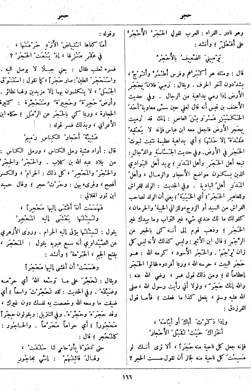 فإِنه جَعَلَ كُلَّ نَاحِيَةٍ مِنْهُ حَجَراً، أَلا تَرَى أَنك لَوْ مَسِسْتَ كُلَّ نَاحِيَةٍ مِنْهُ لَجَازَ أَن تَقُولَ مَسِسْتُ الْحَجَرَ؟ وَقَوْلُهُ: أَمَا كَفَاهَا انْتِياضُ الأَزْدِ حُرْمَتَها، فِي عُقْرِ مَنْزِلها، إِذْ يُنْعَتُ الحَجَرُ؟. فَسَّرَهُ ثَعْلَبٌ فَقَالَ: يَعْنِي جَبَلًا لَا يُوصَلُ إِليه. واسْتَحْجَرَ الطينُ: صَارَ حَجَراً، كَمَا تَقُولُ: اسْتَنْوَق الجَمَلُ، لَا يَتَكَلَّمُونَ بِهِمَا إِلَّا مَزِيدَيْنِ وَلَهُمَا نَظَائِرُ. وأَرضٌ حَجِرَةٌ وحَجِيرَةٌ ومُتَحَجِّرة: كَثِيرَةُ الْحِجَارَةِ، وَرُبَّمَا كُنِّيَ بالحَجَر عَنِ الرَّمْلِ؛ حَكَاهُ ابْنُ الأَعرابي، وَبِذَلِكَ فَسَّرَ قَوْلَهُ: