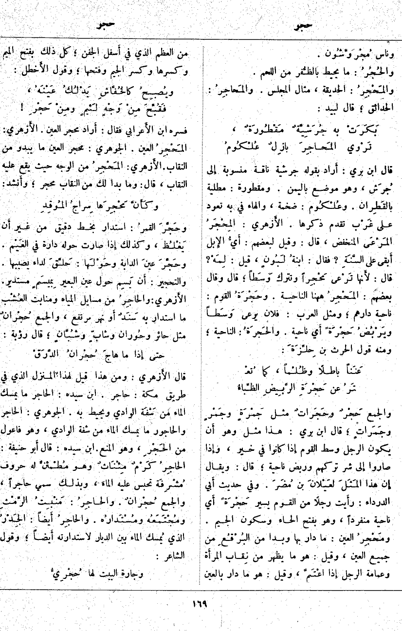 قَالَ الأَزهري: وَمِنْ هَذَا قِيلَ لِهَذَا الْمَنْزِلِ الَّذِي فِي طَرِيقِ مَكَّةَ: حَاجِرٌ. ابْنُ سِيدَهْ: الْحَاجِرُ مَا يُمْسِكُ الْمَاءَ مِنْ شَفَة الْوَادِي وَيُحِيطُ بِهِ. الْجَوْهَرِيُّ: الْحَاجِرُ وَالْحَاجُورُ مَا يُمْسِكُ الْمَاءَ مِنْ شَفَةِ الْوَادِي، وَهُوَ فَاعُولٌ مِنَ الحَجْرِ، وَهُوَ الْمَنْعُ. ابْنُ سِيدَهْ: قَالَ أَبو حَنِيفَةَ: الحاجِرُ كَرْمٌ مِئْنَاثٌ وَهُوَ مُطْمئنٌّ لَهُ حُرُوفٌ مُشْرِفَة تَحْبِسُ عَلَيْهِ الماءَ، وَبِذَلِكَ سُمِّيَ حَاجِرًا، وَالْجَمْعُ حُجْرانٌ. والحاجِرُ: مَنْبِتُ الرِّمْثِ ومُجْتَمَعُه ومُسْتَدارُه. والحاجِرُ أَيضاً: الجِدْرُ [الجَدْرُ] الَّذِي يُمسك الْمَاءَ بَيْنَ الدِّيَارِ لِاسْتِدَارَتِهِ أَيضاً؛ وَقَوْلُ الشَّاعِرِ: